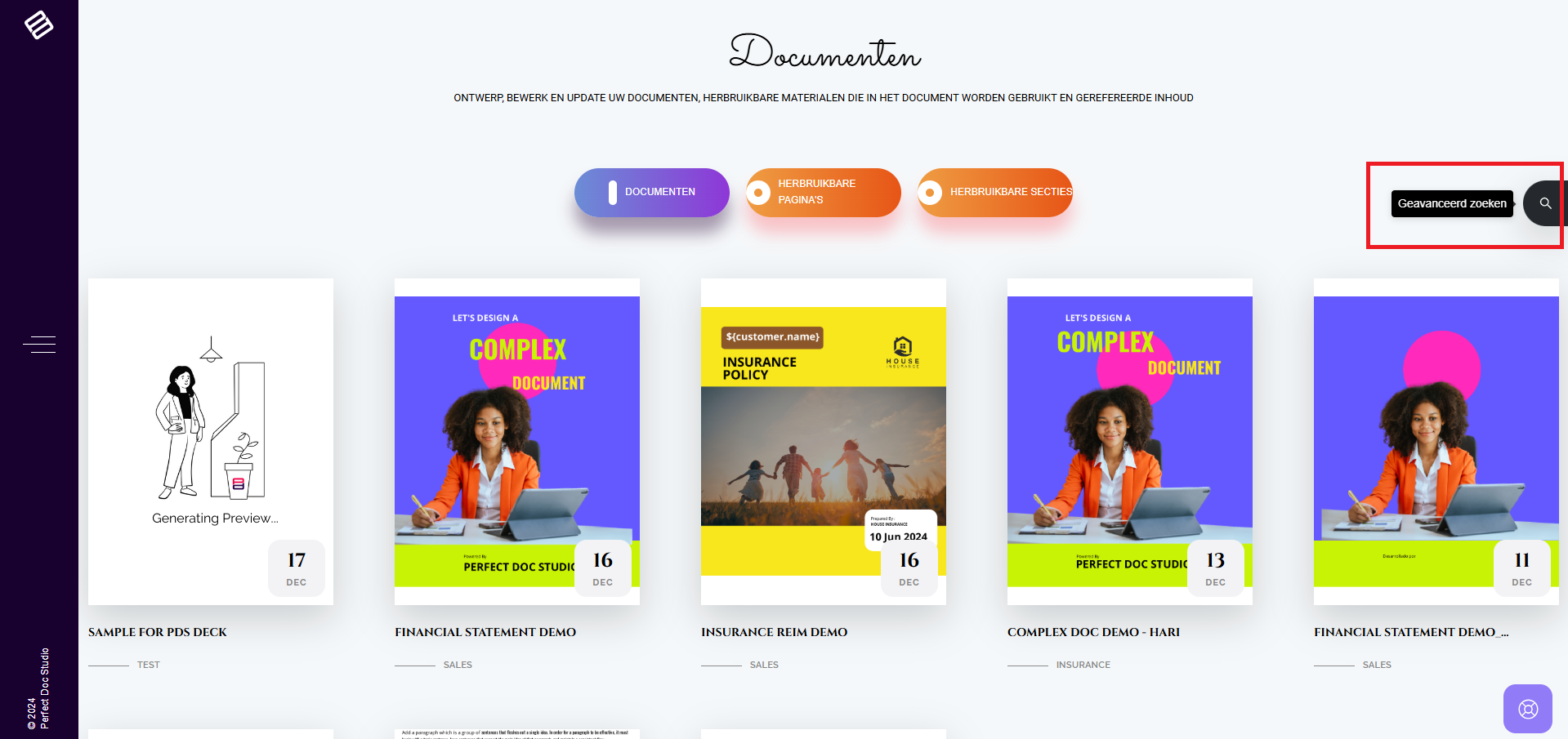 4. Als u wilt filteren/zoeken naar een specifiek document, kunt u de zijbalk gebruiken. Raadpleeg de documentatie voor meer informatie over het gebruik van de zijbalk.