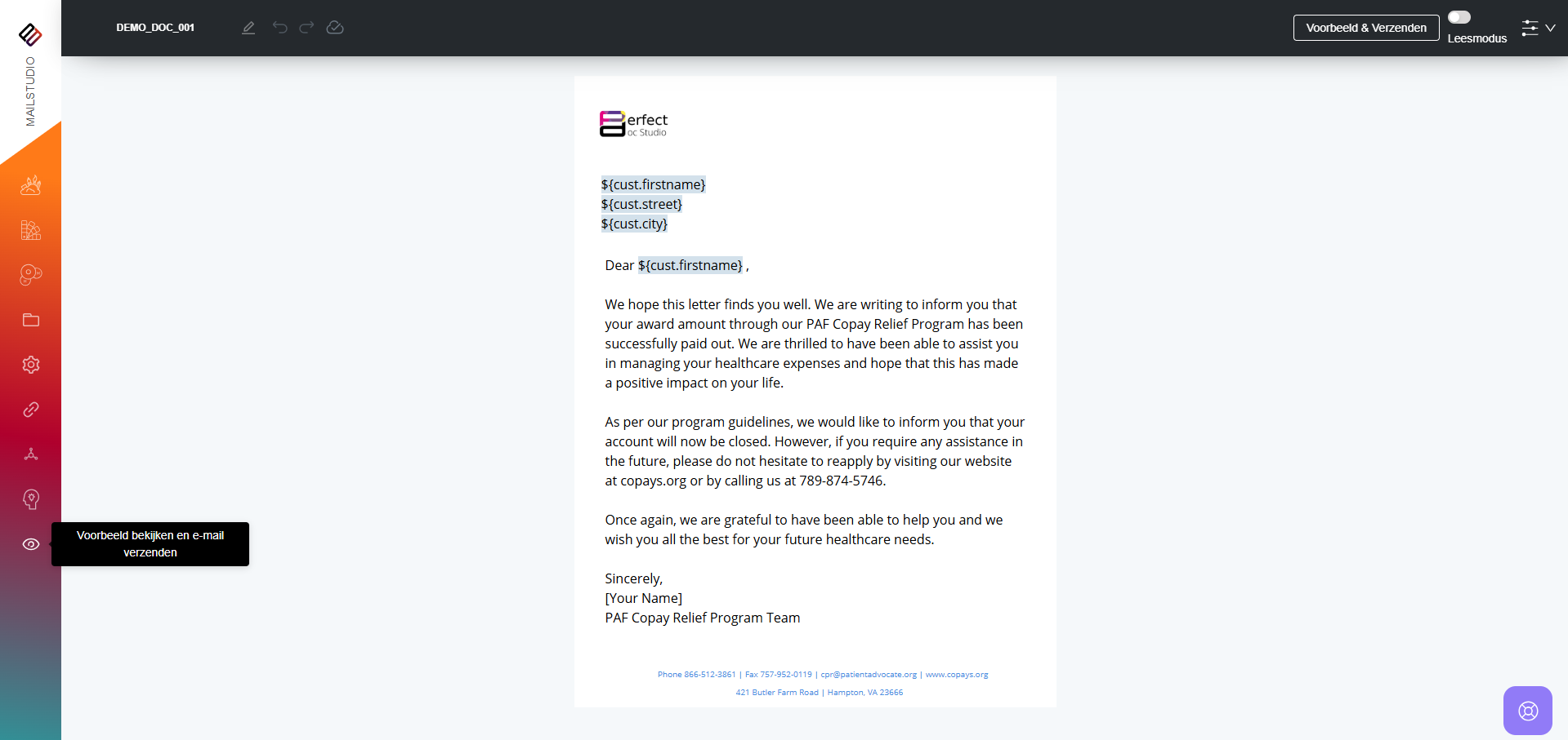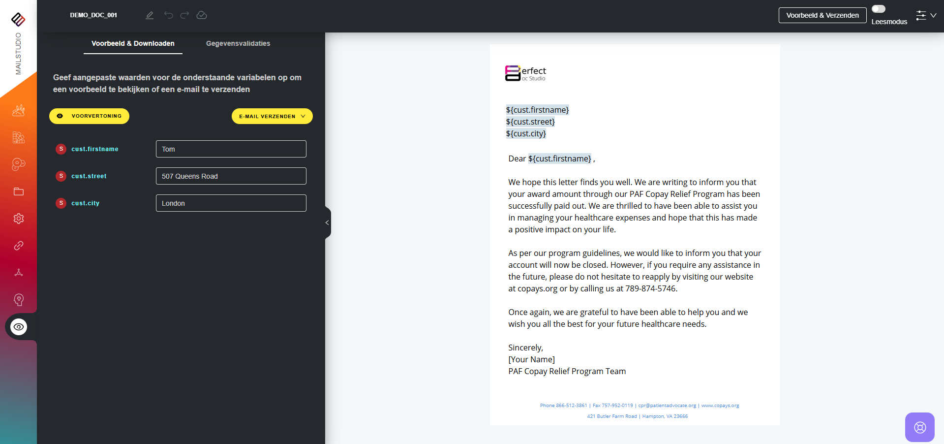 Hier worden de variabelen weergegeven die in de e-mailsjabloon zijn opgenomen, samen met een optie om gegevens in te voeren voor elke variabele die in de sjabloon is opgenomen.