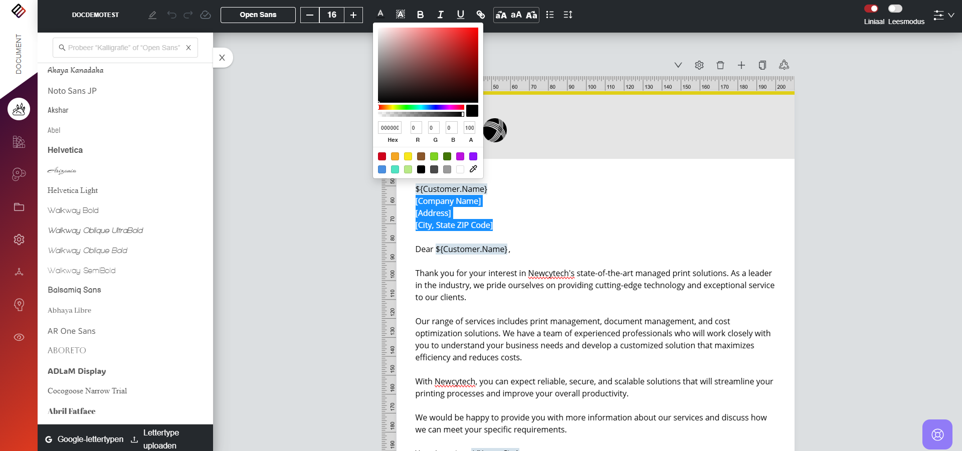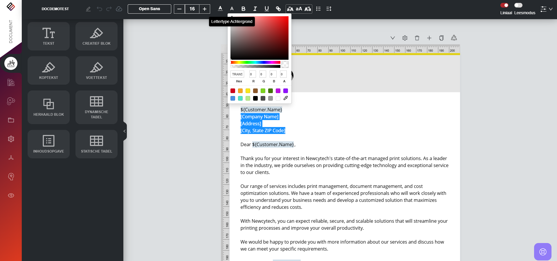 Letterkleur en achtergrond: Voor letterkleur klikt u op de kleuroptie om een kleurenpalet te openen. Hier kunt u een kleur selecteren of specifieke RGB-waarden invoeren voor meer precisie. Gebruik de schuifbalk voor dekking om de transparantie van uw tekstkleur aan te passen indien nodig.