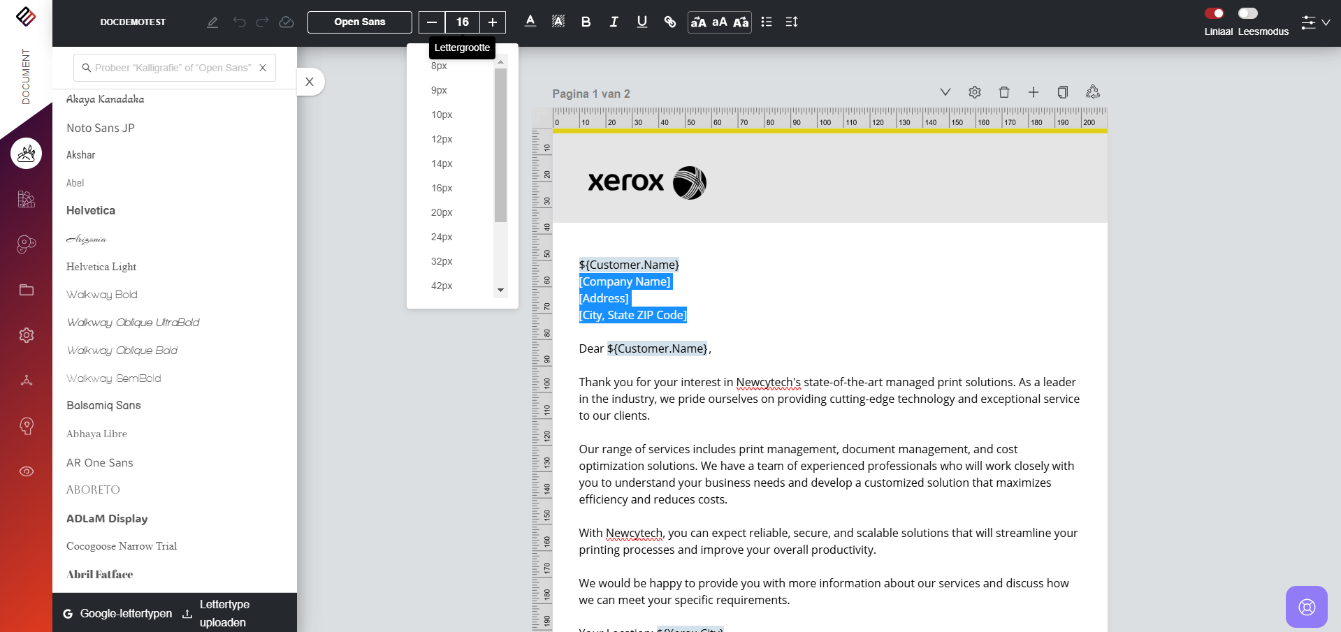 Lettertypekeuze: om een lettertype te selecteren, klikt u op de optie 'Lettertype' in de bovenste werkbalk. Er verschijnt een vervolgkeuzemenu met alle beschikbare lettertypen. Blader door en klik op uw favoriete lettertype om het toe te passen op uw geselecteerde tekst.
