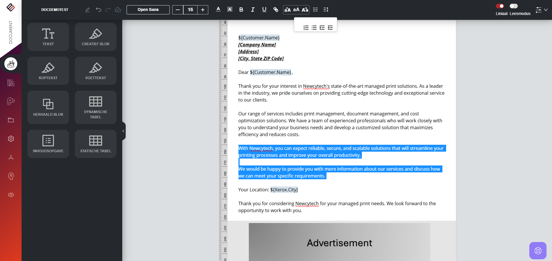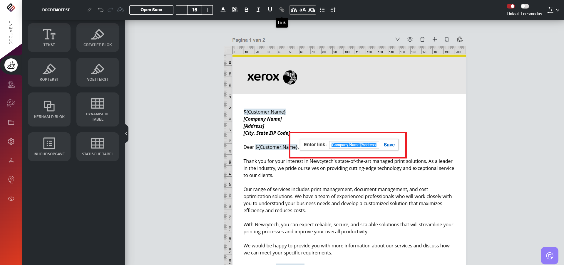 Een link toevoegen: Om een hyperlink in te voegen, markeert u de tekst die u wilt linken en klikt u op de optie 'Link'. Er verschijnt een veld waarin u de URL kunt plakken of typen. Bevestig om de hyperlink in uw tekst in te sluiten.