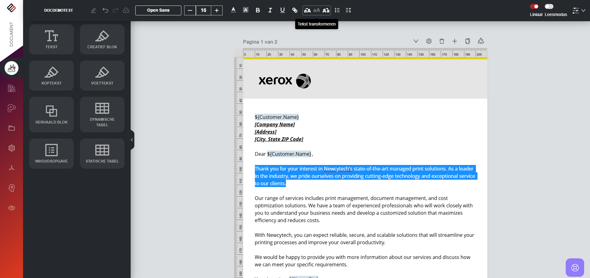 Om tekstinhoud toe te voegen aan een documentsjabloon in Perfect Doc Studio: 1. Ga naar de optie "Laten we ontwerpen" in het menu aan de linkerkant. 2. Klik op de menuoptie 'Tekst' in het linkerpaneel. 3. Versleep de gewenste tekstinhoud als ...