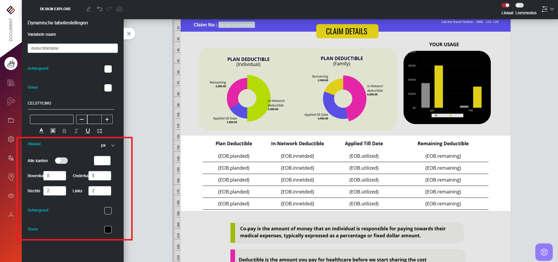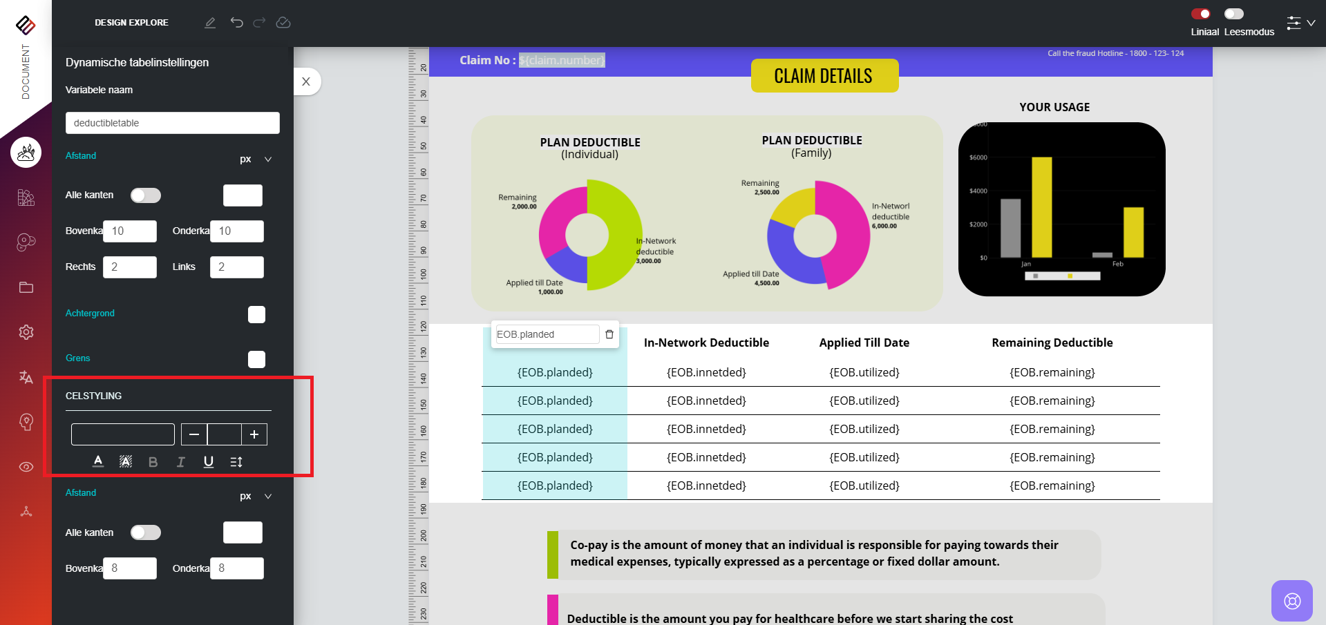 Celstyling: Naast header styling krijgen gebruikers de flexibiliteit om cell styling aan te passen aan hun voorkeuren. Onder het cell styling gedeelte is een reeks opties beschikbaar, waarmee gebruikers het lettertype, de grootte, de kleur en de tekstopmaak, zoals vet, cursief en onderstreept, kunnen aanpassen. Bovendien kunnen gebruikers de tekstafstand aanpassen met de geboden afstandsoptie.