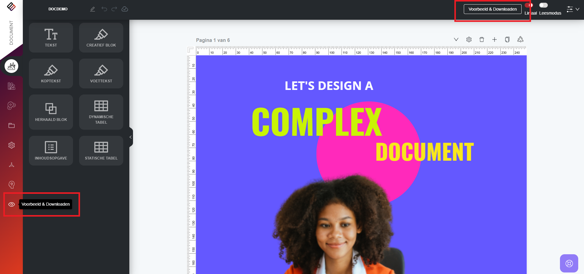 Gebruikers kunnen een gepersonaliseerd document downloaden van het ontwerpgebied door te klikken op de knop "Voorbeeld & Downloaden" bovenaan. Deze actie brengt hen naar de sectie Preview and Download, die ook toegankelijk is via het menu aan de linkerkant.