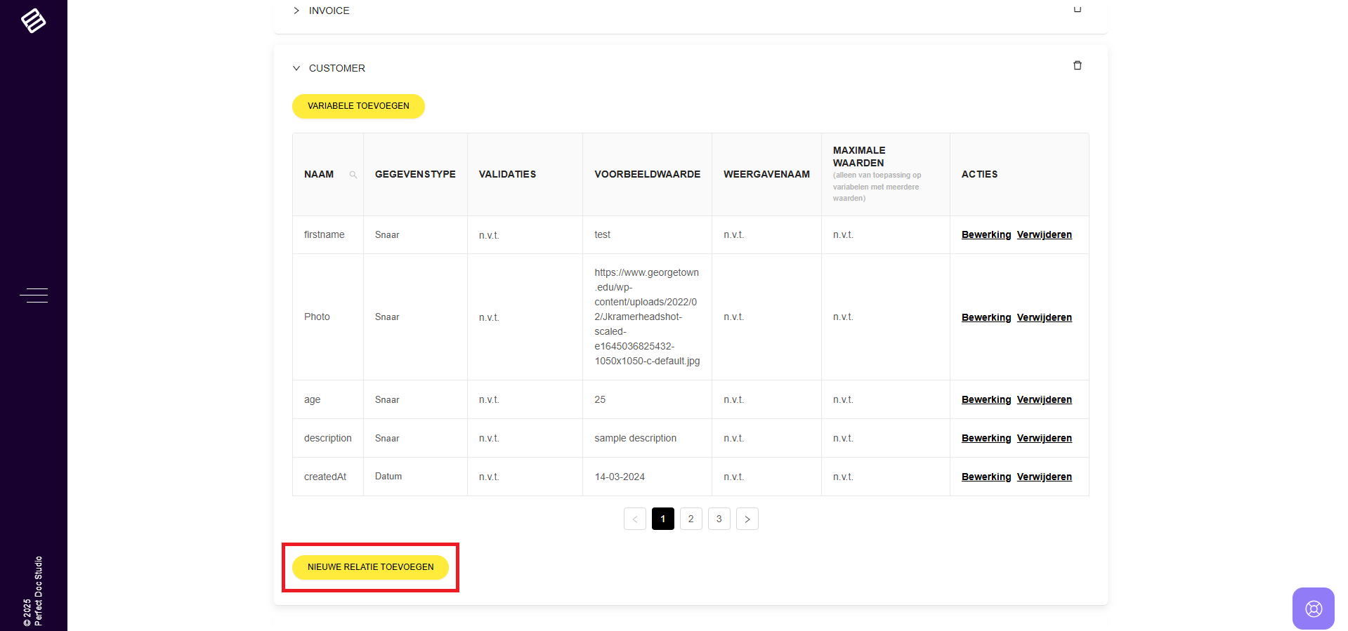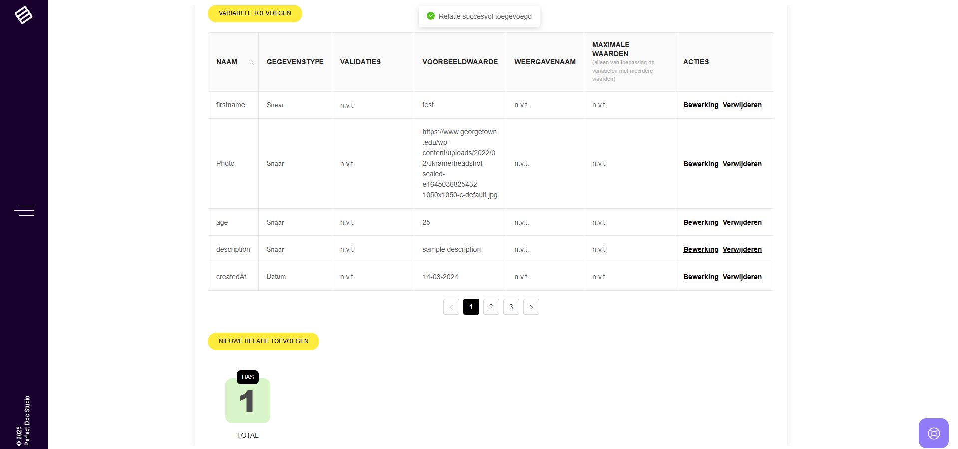 In Perfect Doc Studio kunt u geneste dynamische tabellen maken door relaties tussen twee entiteiten vast te leggen in de variabelensectie. Met deze instelling kunnen de variabelen van de ene entiteit worden gekoppeld aan die van de andere, waardoor tabellen dynamisch kunnen worden uitgebreid op basis van hun gegevensrelaties.