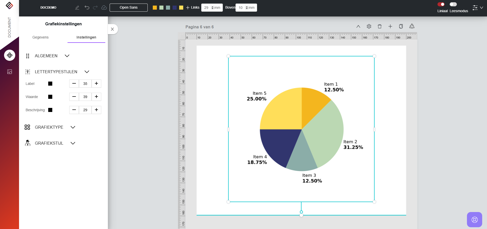 Nadat u het gewenste diagramtype hebt geselecteerd, wordt een tijdelijke cirkeldiagram met vooraf gedefinieerde waarden en labels ingevoegd op het ontwerpcanvas. Om dit diagram aan te passen: