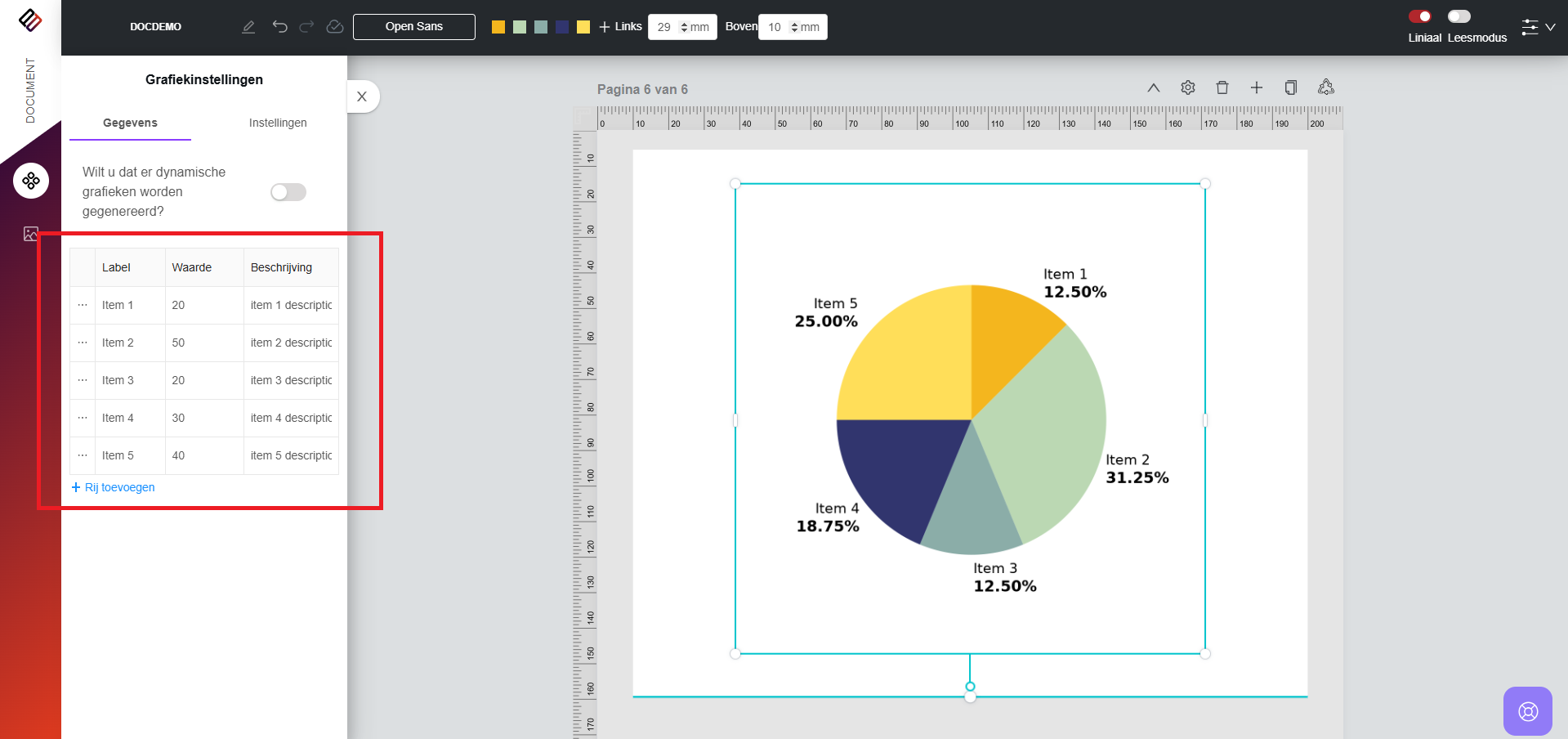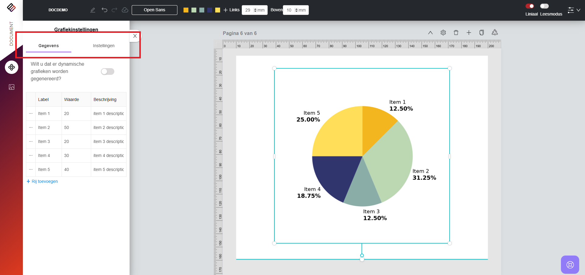 3. Op het tabblad Gegevens kunnen gebruikers de waarden, labels en beschrijvingen wijzigen die aan de diagramsegmenten zijn gekoppeld.