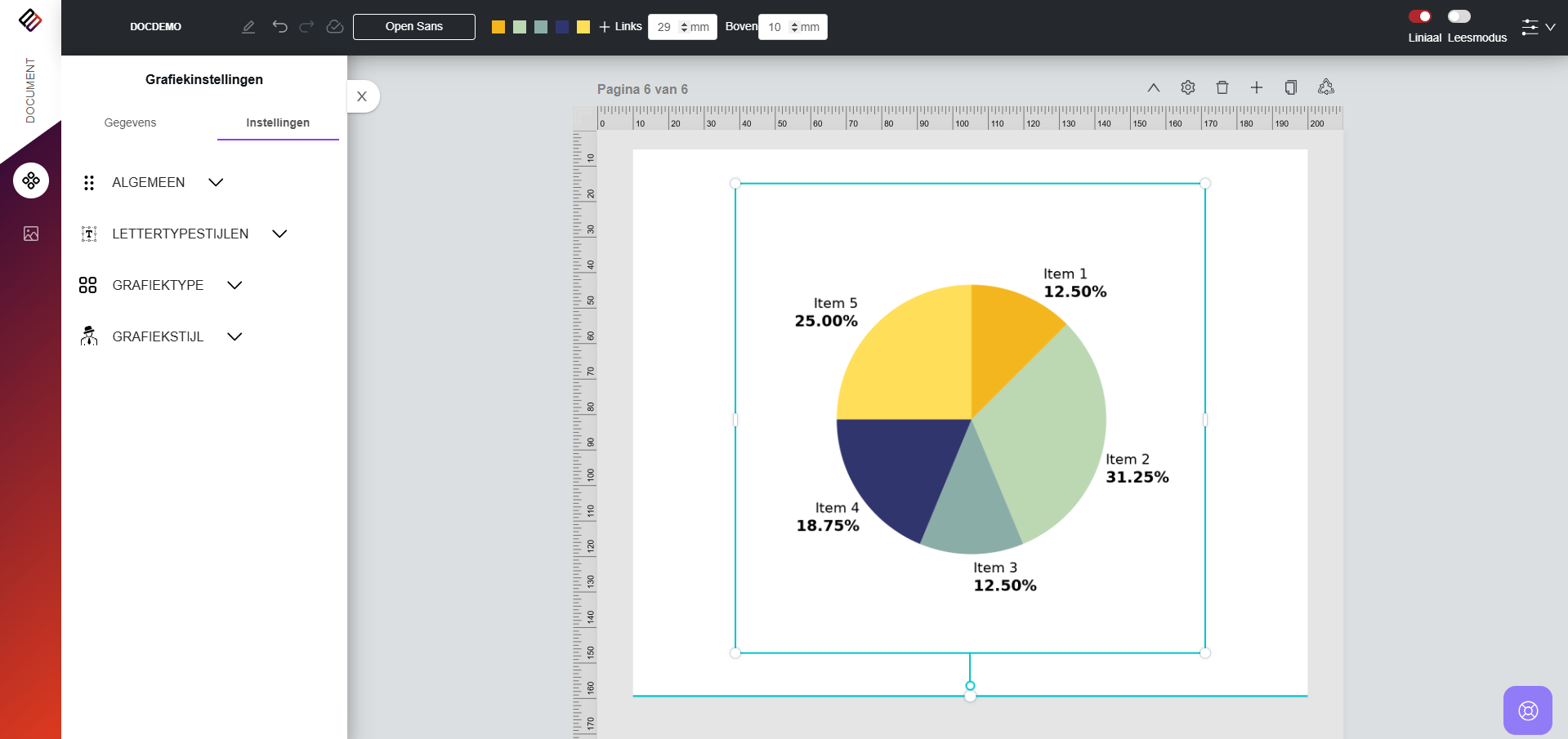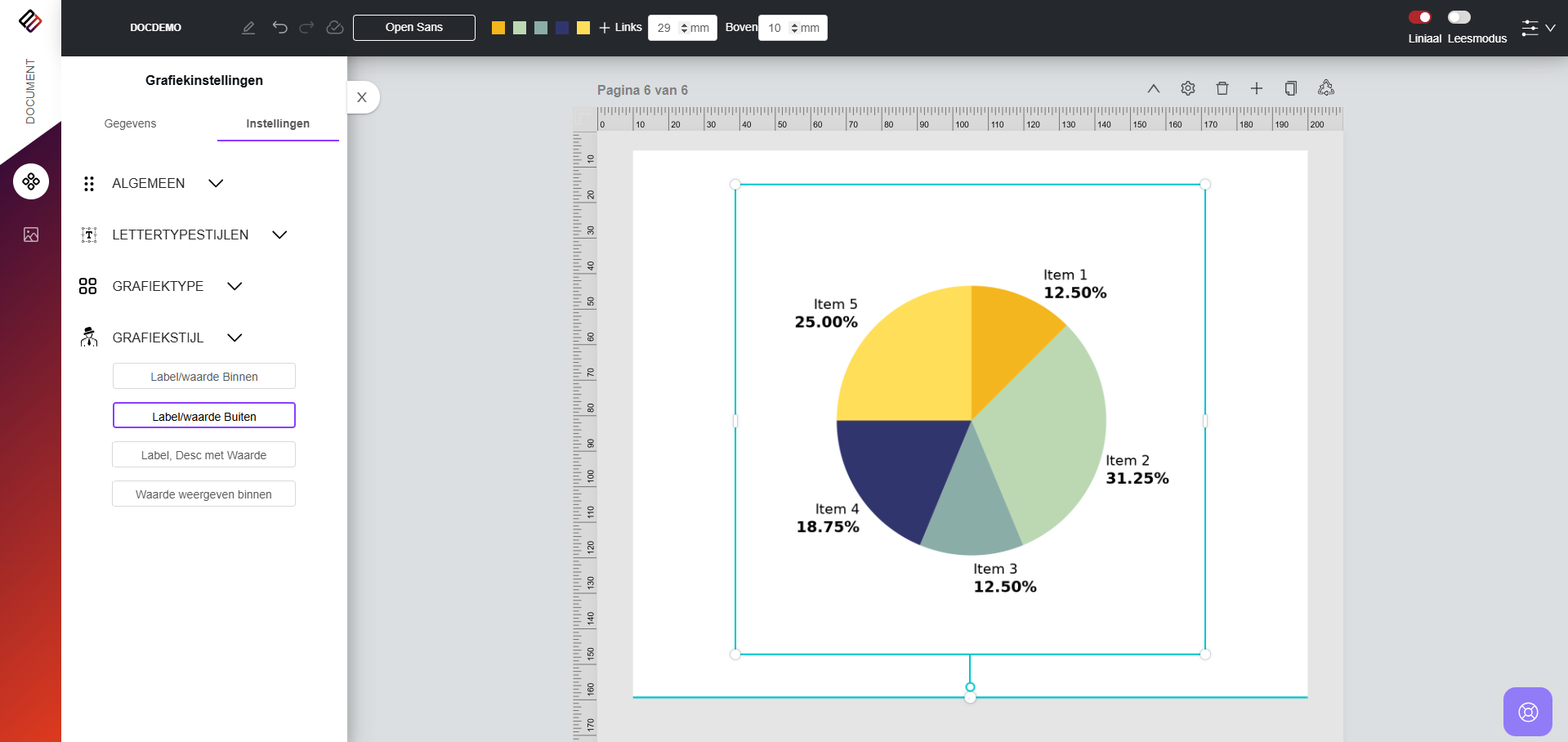 8. Grafiektype: Hiermee kunnen gebruikers wisselen tussen verschillende grafiekstijlen, zoals Pie, Pie met callout, Donut en Donut met callout. Door simpelweg het gewenste grafiektype te selecteren, wordt de grafiek direct dienovereenkomstig getransformeerd.