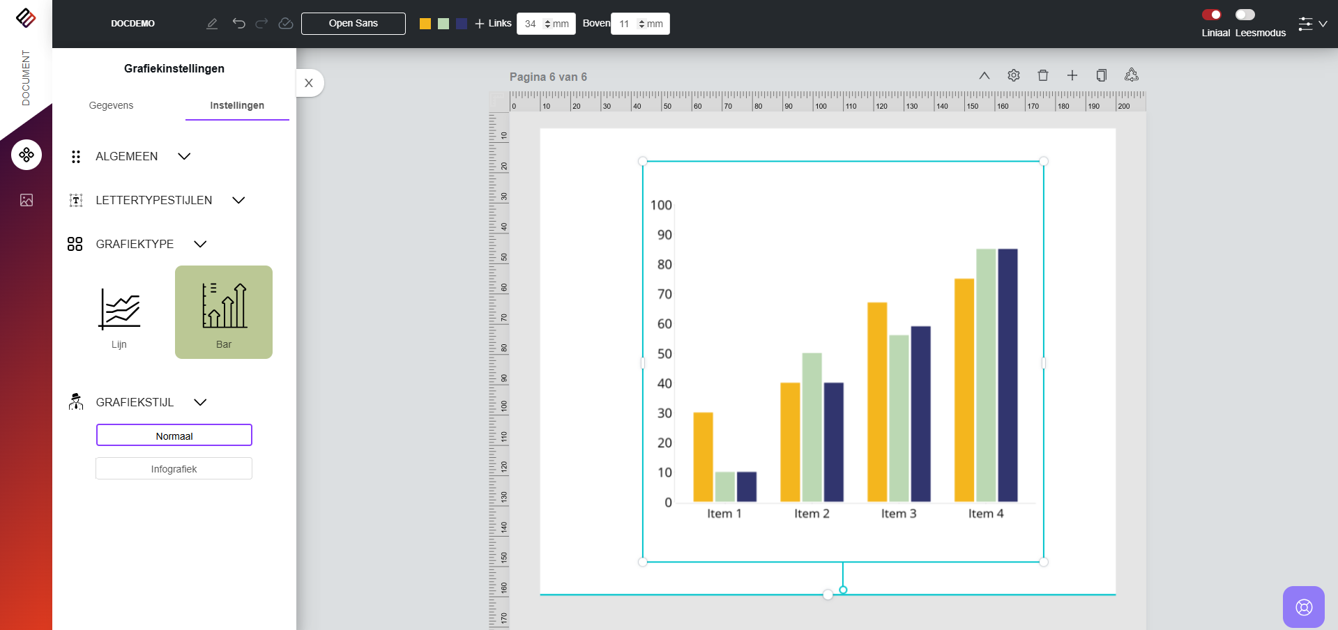 7. Net als bij cirkel- en ringdiagrammen kunnen gebruikers de kleuren van de balken toevoegen en aanpassen via het bovenste menu op de ontwerppagina.