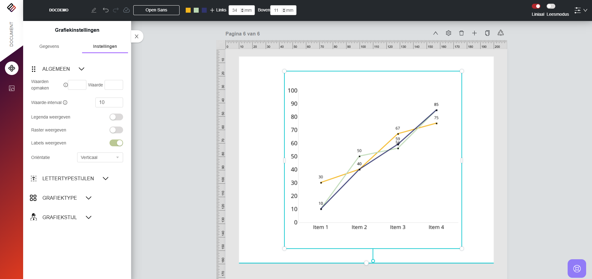 6. Algemeen: Gebruikers kunnen verschillende instellingen wijzigen, zoals het opmaken van waarden, het in- of uitschakelen van labels en legenda's en het aanpassen van de positie van de legenda.