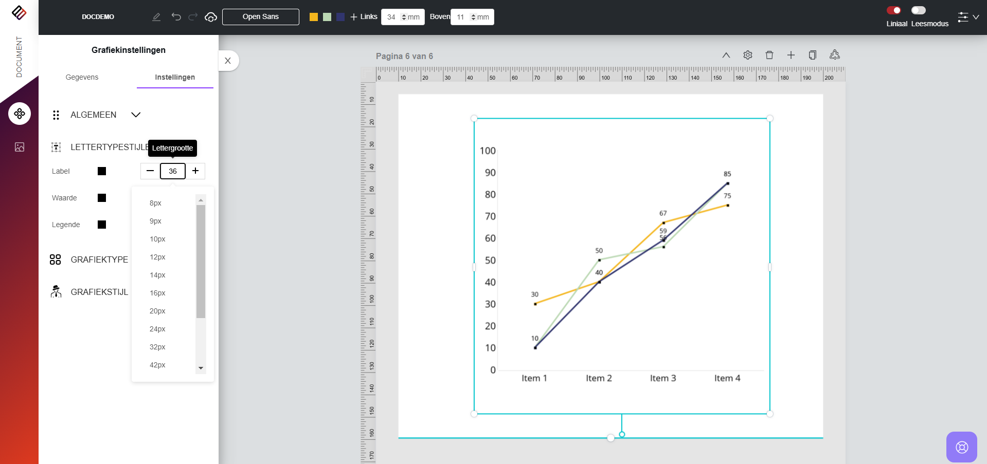 7. Lettertype: In het gedeelte Lettertype kunnen gebruikers lettergroottes opgeven voor labels, waarden en beschrijvingen die op de grafiek worden weergegeven. Daarnaast kunnen gebruikers de algehele lettertypestijl aanpassen met de opties in de bovenste balk.