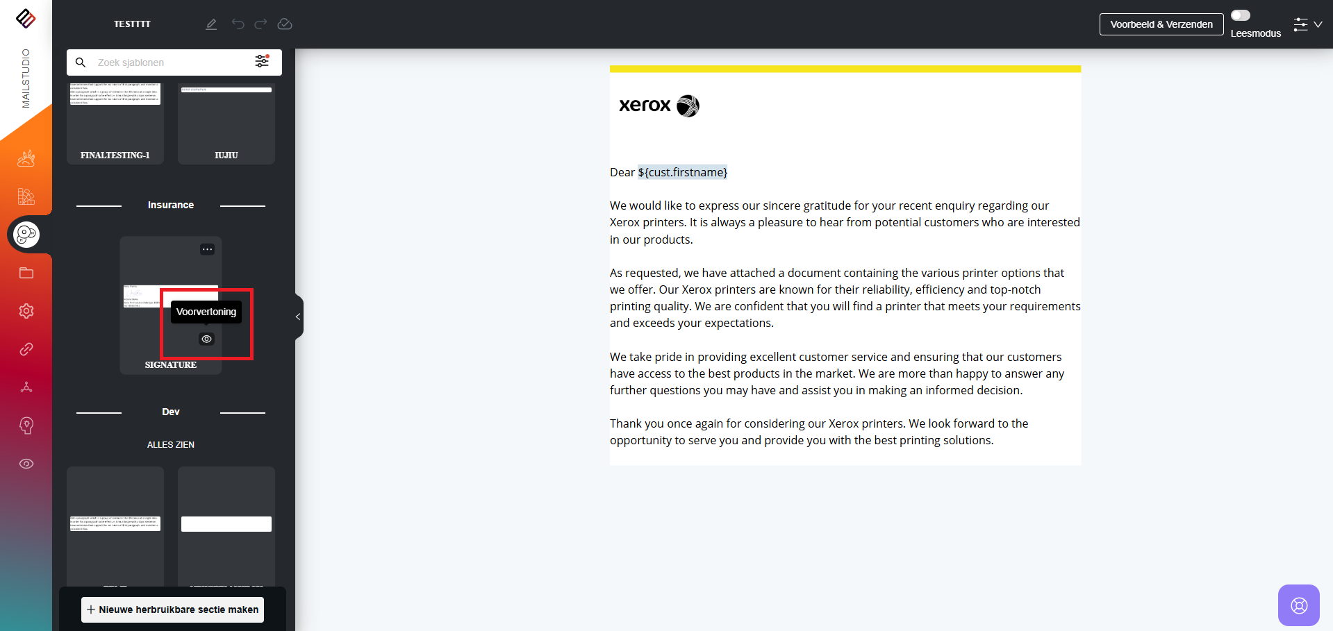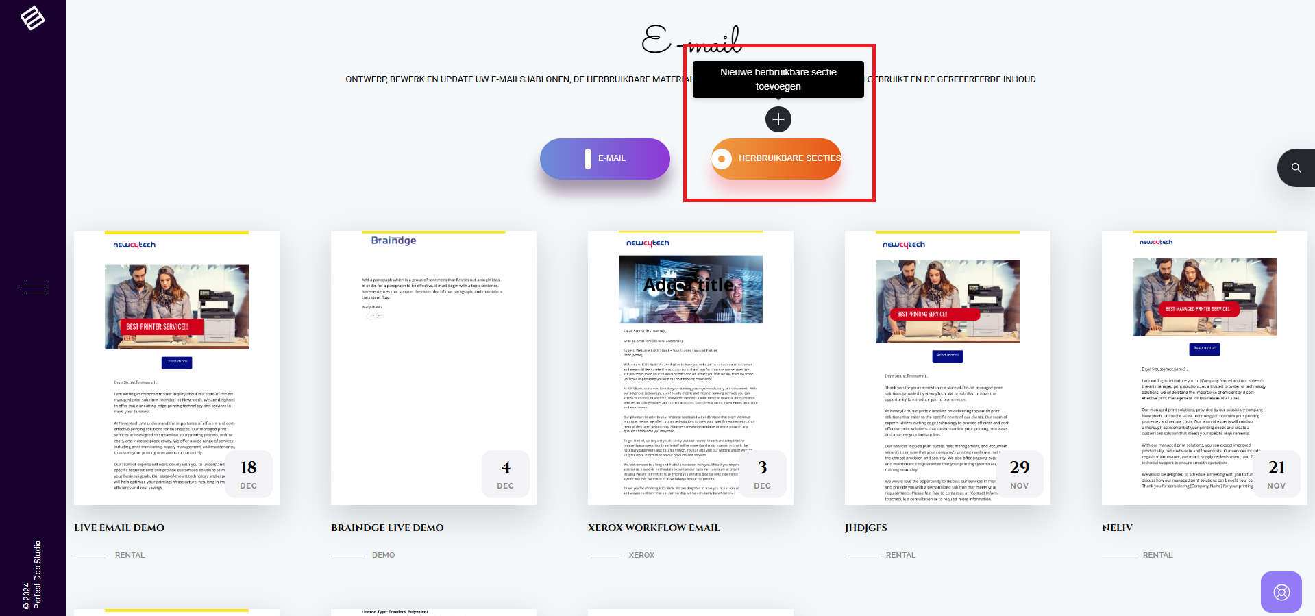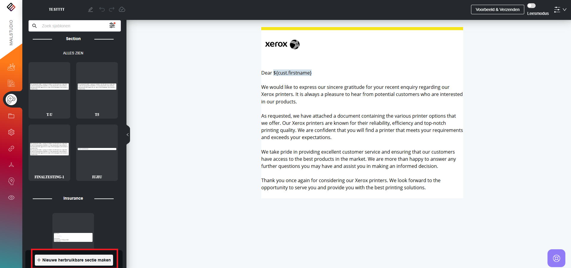 Gebruikers kunnen eenvoudig herbruikbare secties maken binnen een e-mailsjabloon door specifieke componenten te ontwerpen, zoals headers, en deze op te slaan in het systeem. Deze secties kunnen vervolgens snel worden geopend en gebruikt in toekomstige sjablonen.