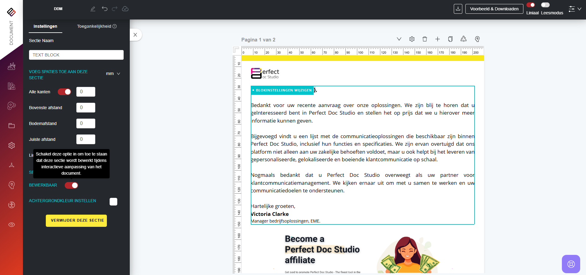 Let op: Een document wordt alleen interactief wanneer de optie Klonen is ingeschakeld. De optie Bewerken voor individuele blokken verschijnt pas in de instellingen nadat Klonen is ingeschakeld. Als Klonen niet is ingeschakeld, kunnen blokken niet interactief worden gemaakt. Zorg er altijd voor dat Klonen is ingeschakeld voordat u uw document interactief maakt.