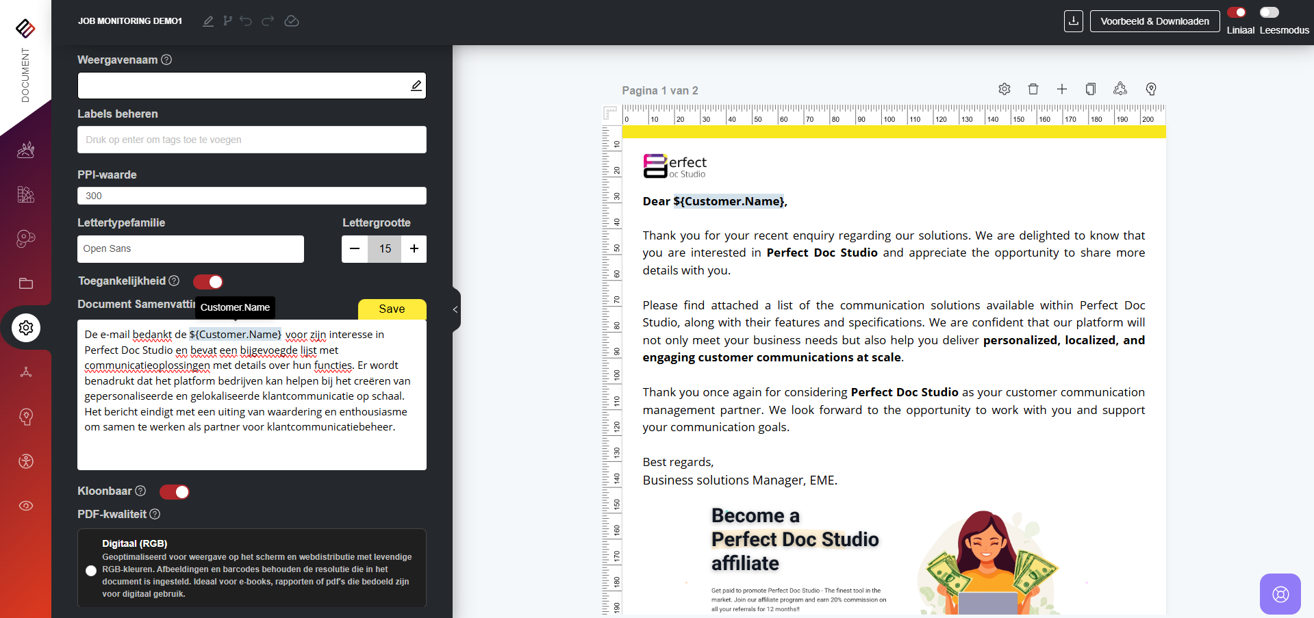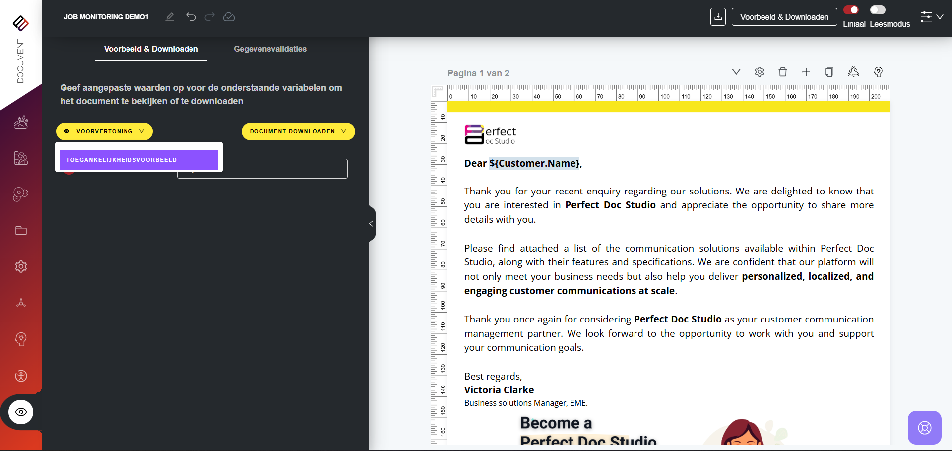 De validator geeft een score en bruikbare suggesties, zoals het verbeteren van het contrast, het aanpassen van de lettergrootte of het verbeteren van de compatibiliteit met schermlezers. Gebruikers kunnen deze wijzigingen vervolgens toepassen en de functie Toegankelijkheidsvoorbeeld gebruiken om te ervaren hoe het document wordt voorgelezen door ondersteunende technologieën, zodat volledige toegankelijkheid wordt gegarandeerd vóór distributie.