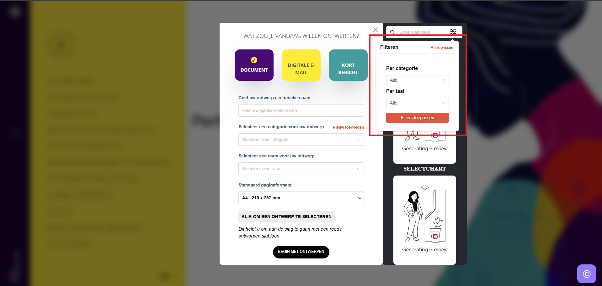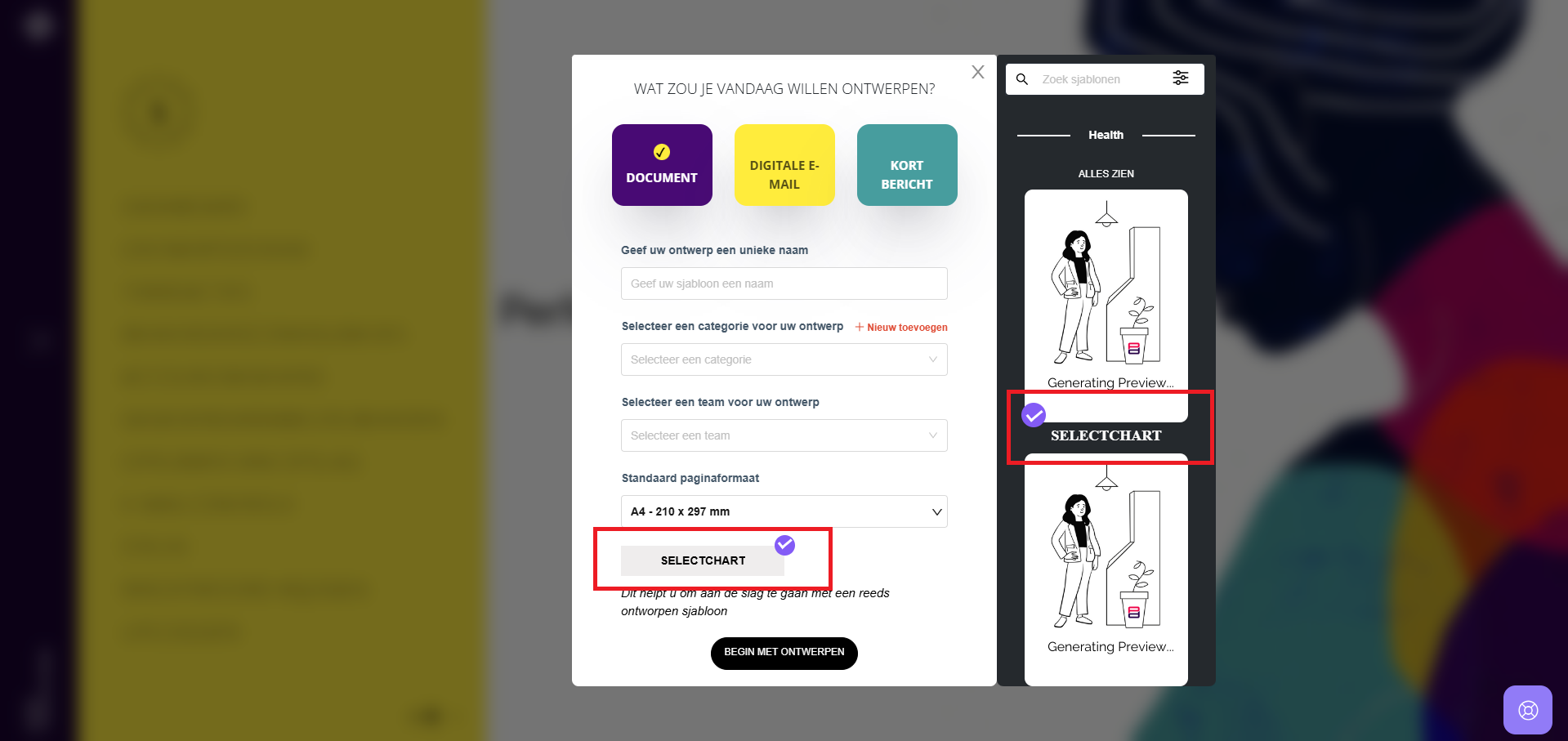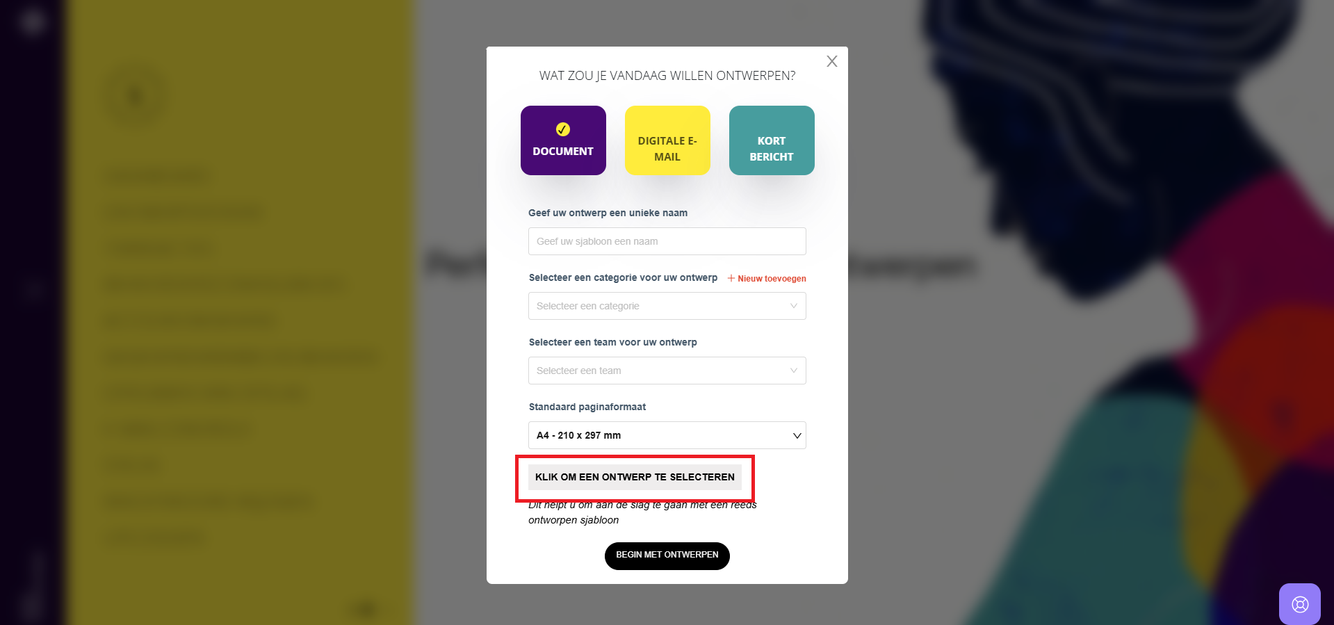 1. Tijdens het maken van een document, na het invoeren van de benodigde informatie zoals de documentnaam, categorie, paginaformaat en team, zal de gebruiker een extra knop zien met het label "Klik hier om een ontwerp te selecteren."