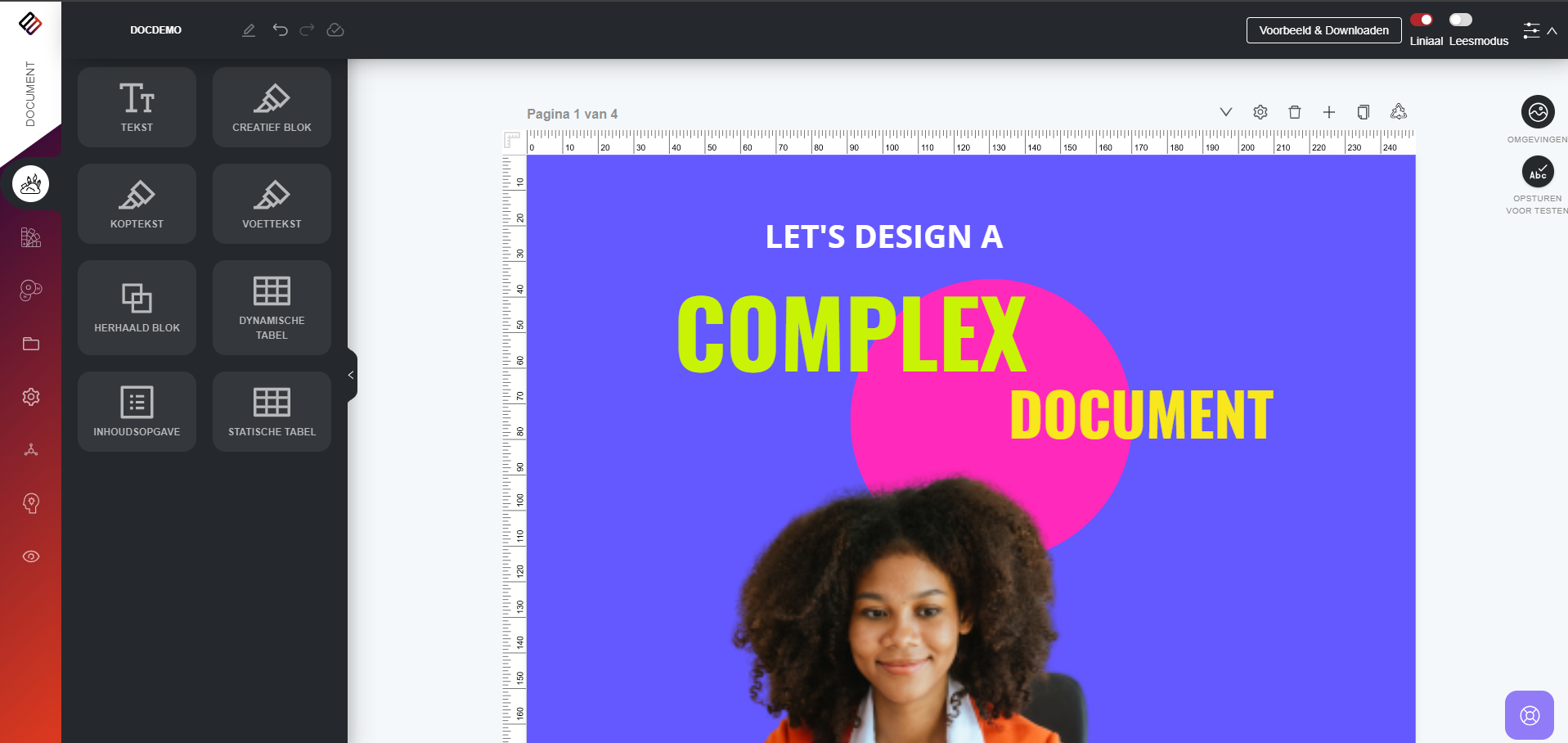 Gebruikers kunnen naadloos schakelen tussen alle drie de omgevingen om de status van de documentsjabloon waaraan ze werken te controleren. Door simpelweg op de gewenste omgeving te klikken of met de muis over de linkerbovenhoek van het omgevingsgebied te bewegen, kunnen ze de bijbehorende omgeving selecteren en weergeven.