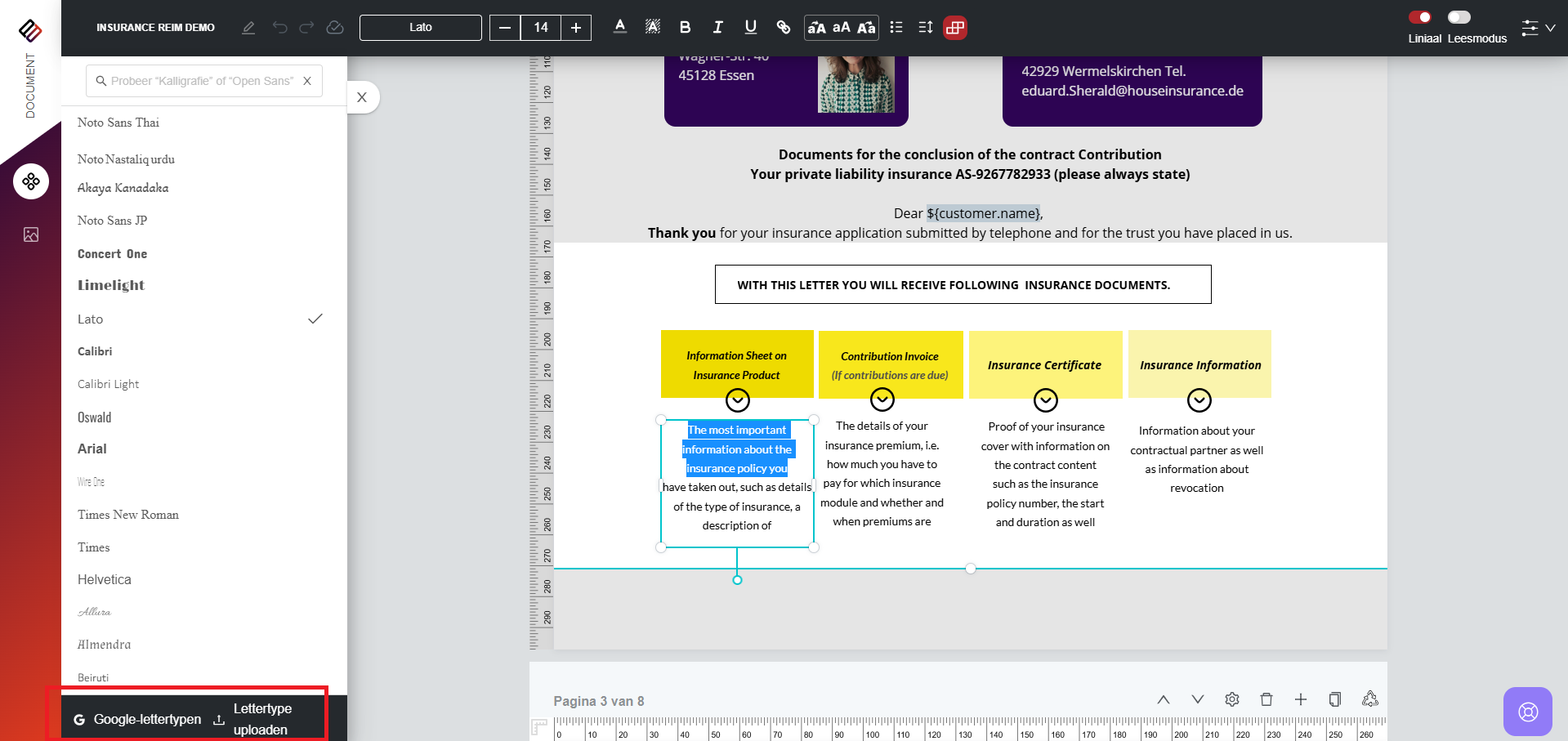 Opslaan en gebruiken: Zodra u de gewenste lettertypen hebt neergezet, klikt u op 'Opslaan'. De geüploade lettertypen zijn nu beschikbaar voor gebruik in PerfectDoc Studio.