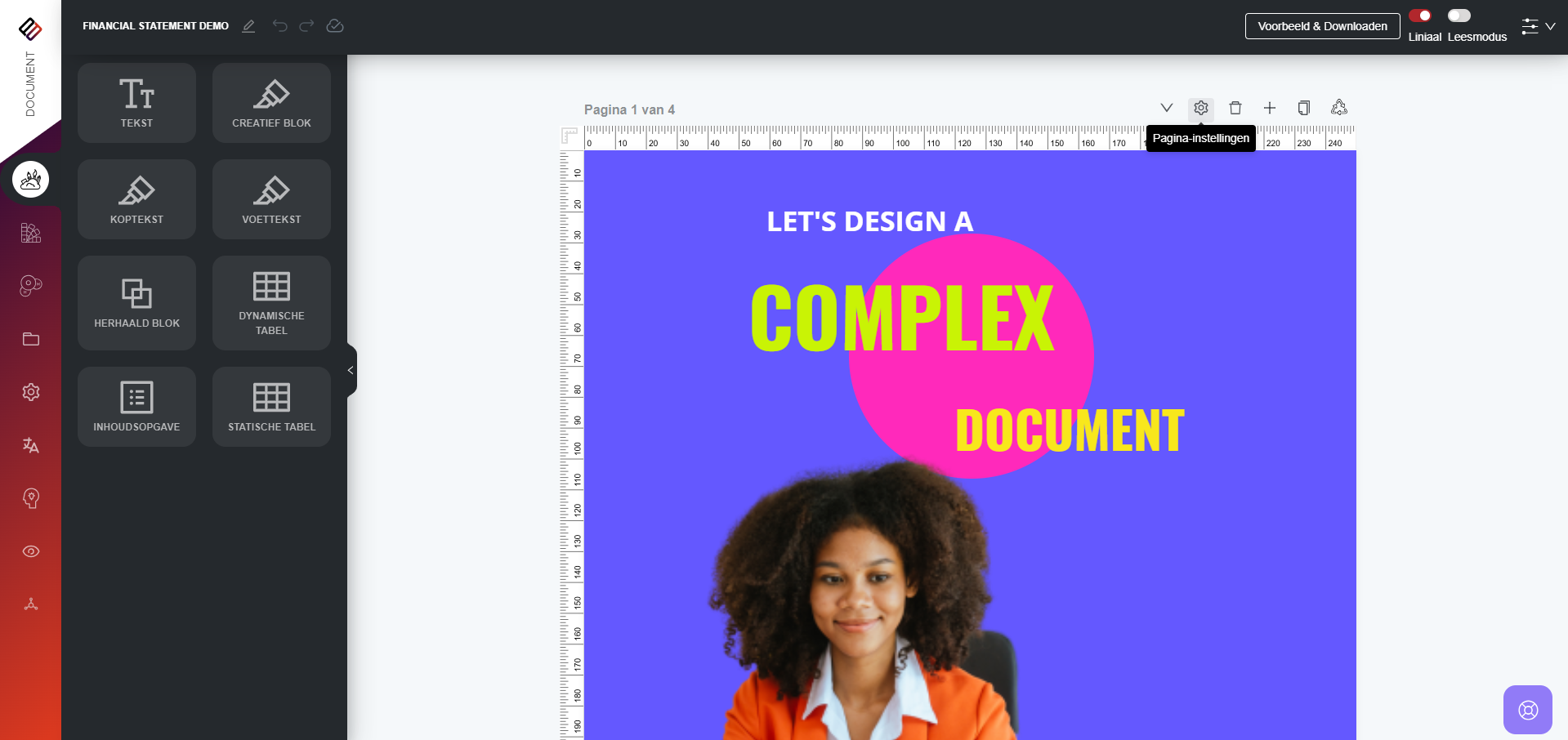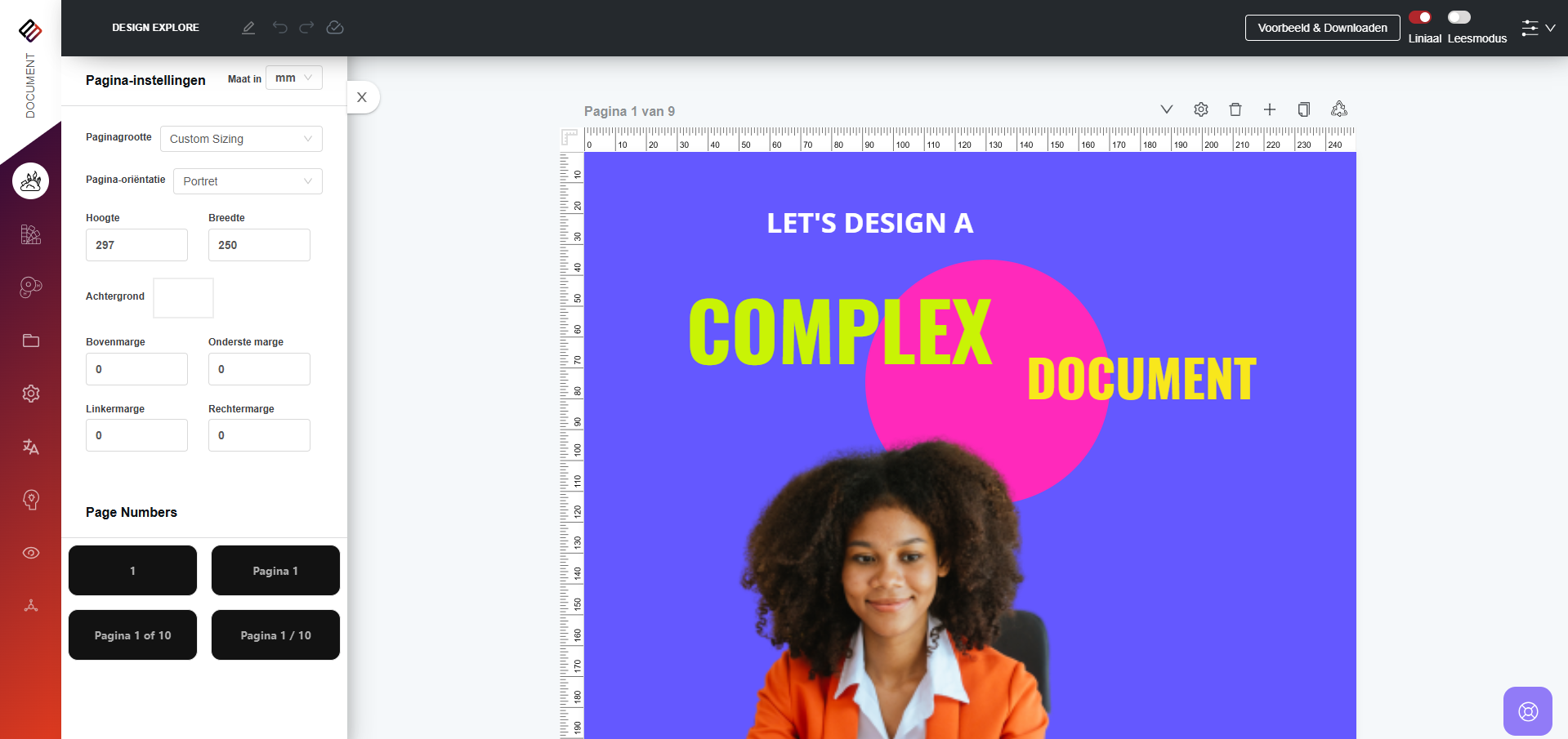 2. Met deze actie wordt aan de linkerkant van het ontwerpgebied een menu geopend met verschillende opties voor het aanpassen van de paginagrootte, de paginastand, de paginanummers en de marges.