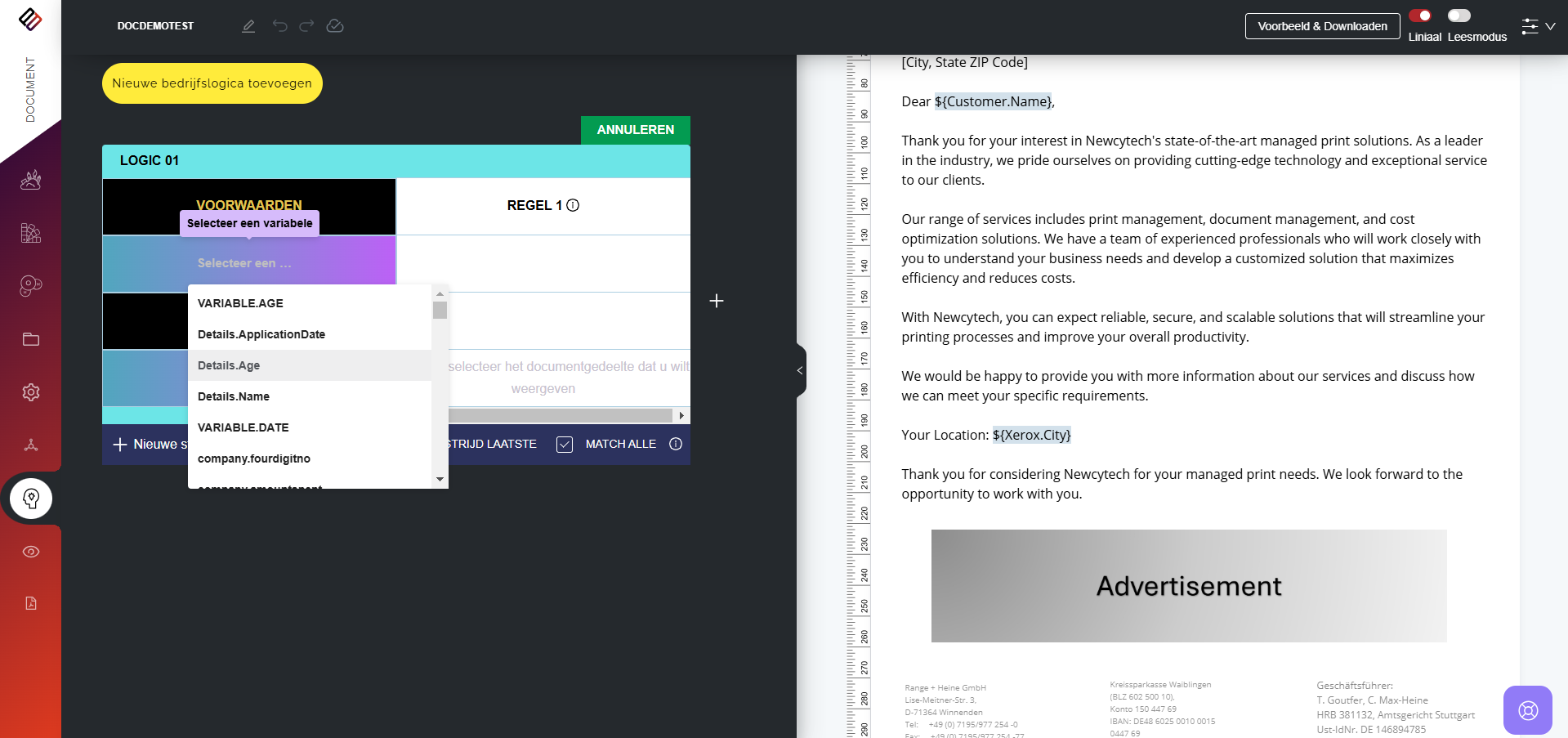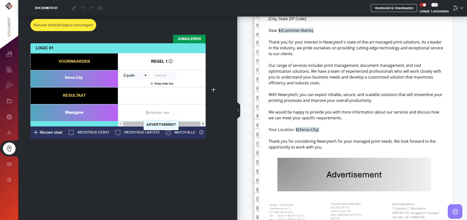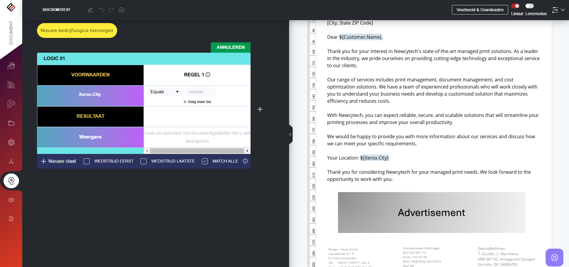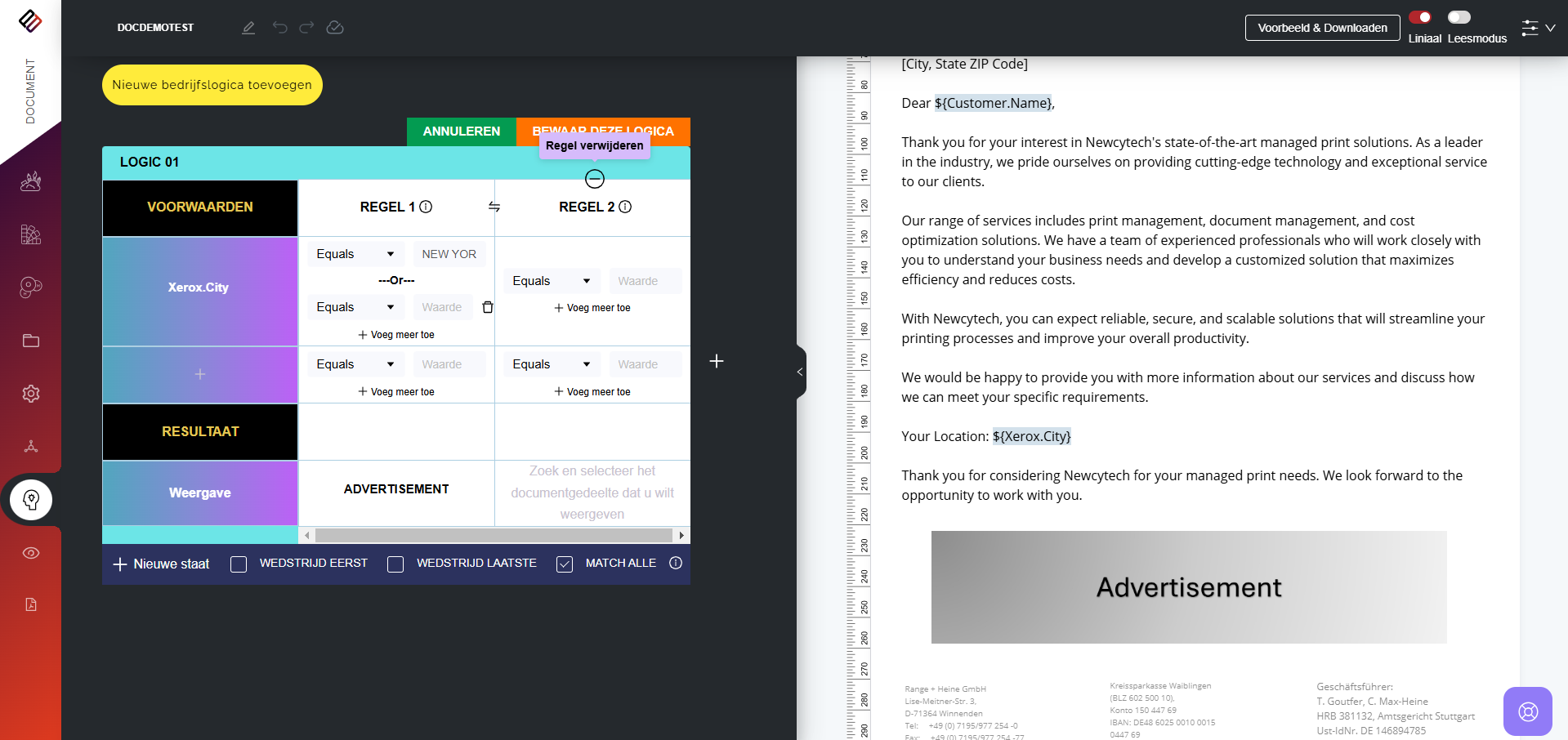 In Perfect Doc Studio kunnen gebruikers regelgestuurde documenten genereren door vooraf gedefinieerde bedrijfsregels en logica toe te passen. Deze regels zijn ontworpen om aan te sluiten bij de unieke vereisten en workflows van een organisatie, zodat elk gegenereerd document voldoet aan de specifieke normen van het bedrijf.