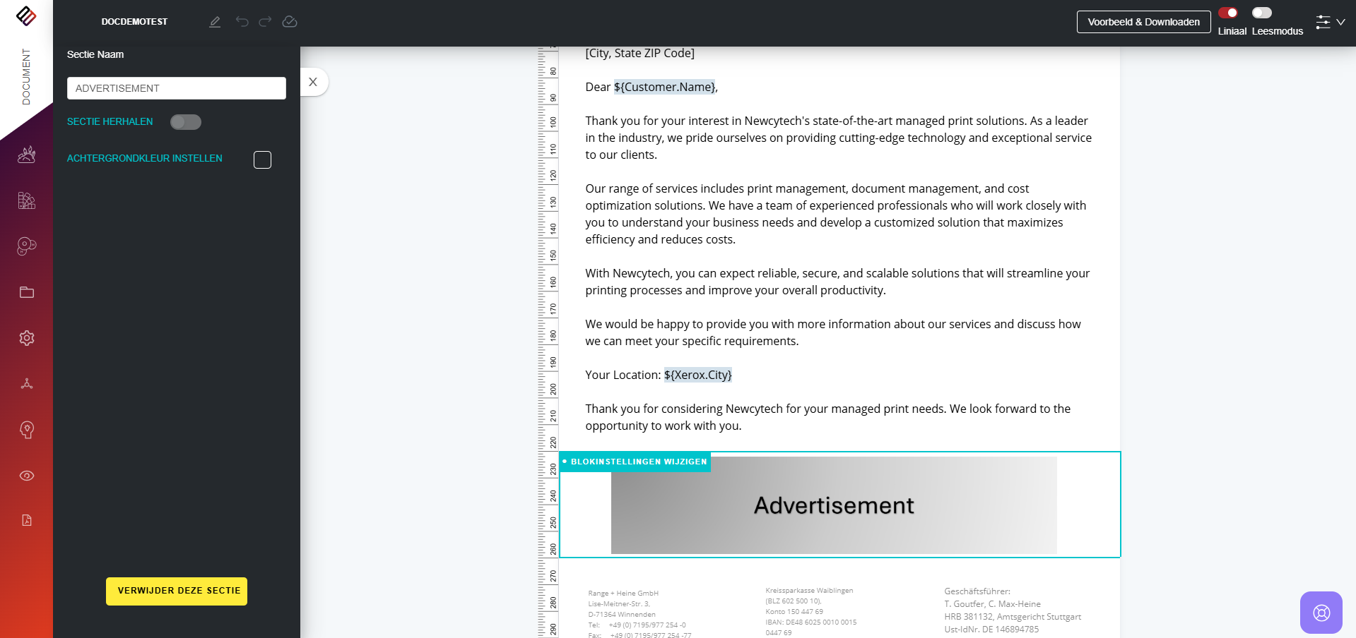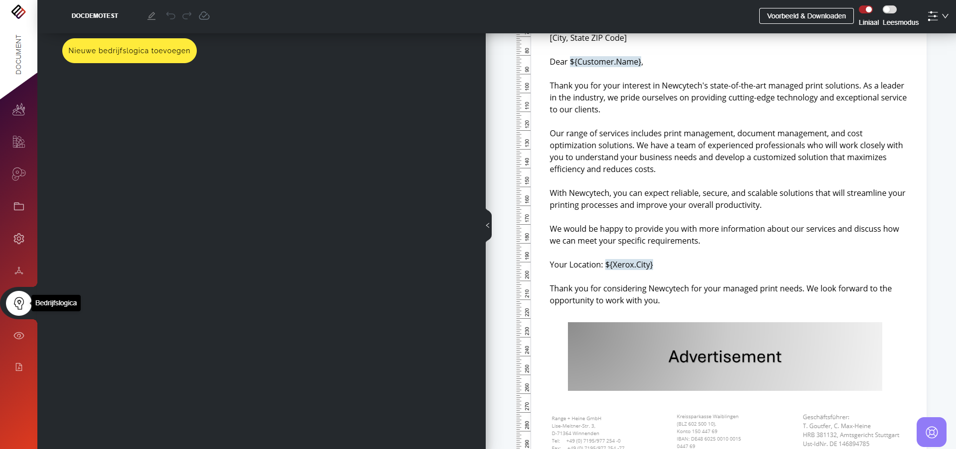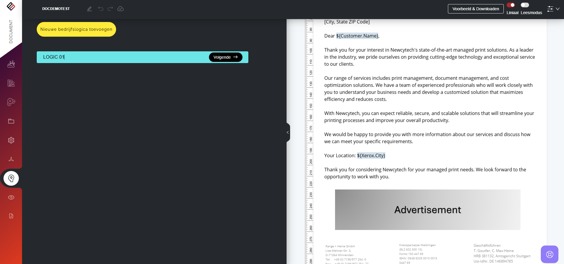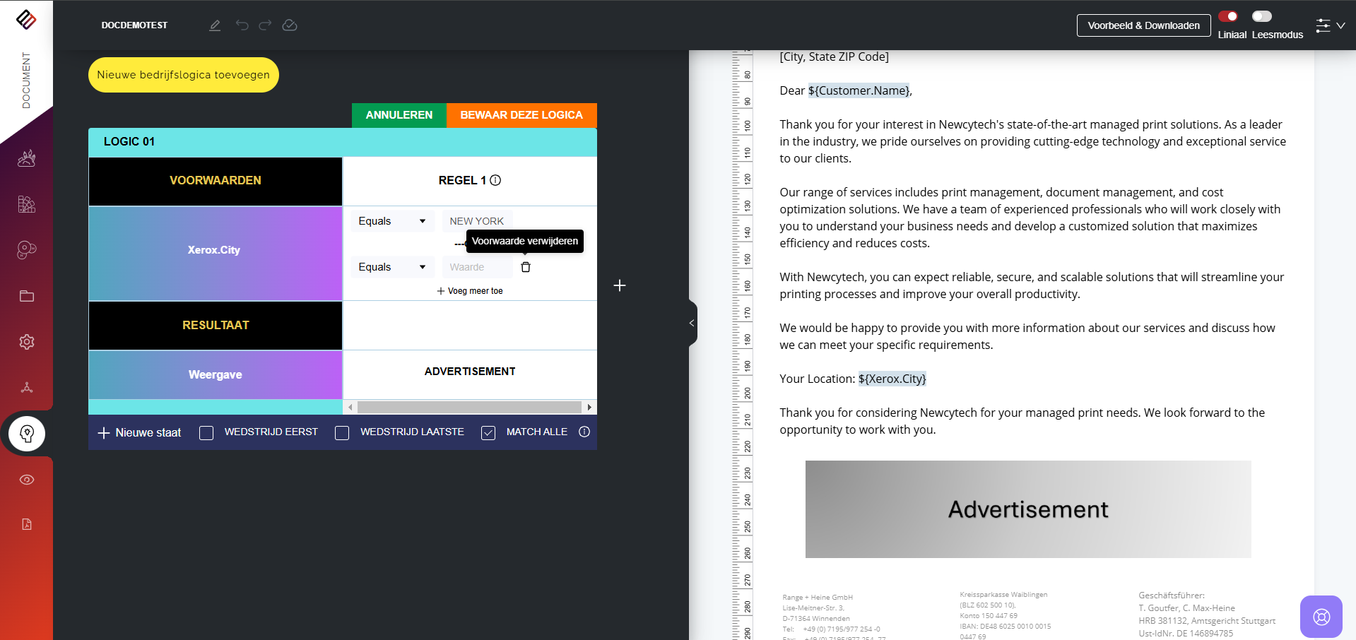 In Perfect Doc Studio kunnen gebruikers regelgestuurde documenten genereren door vooraf gedefinieerde bedrijfsregels en logica toe te passen. Deze regels zijn ontworpen om aan te sluiten bij de unieke vereisten en workflows van een organisatie, zodat elk gegenereerd document voldoet aan de specifieke normen van het bedrijf.