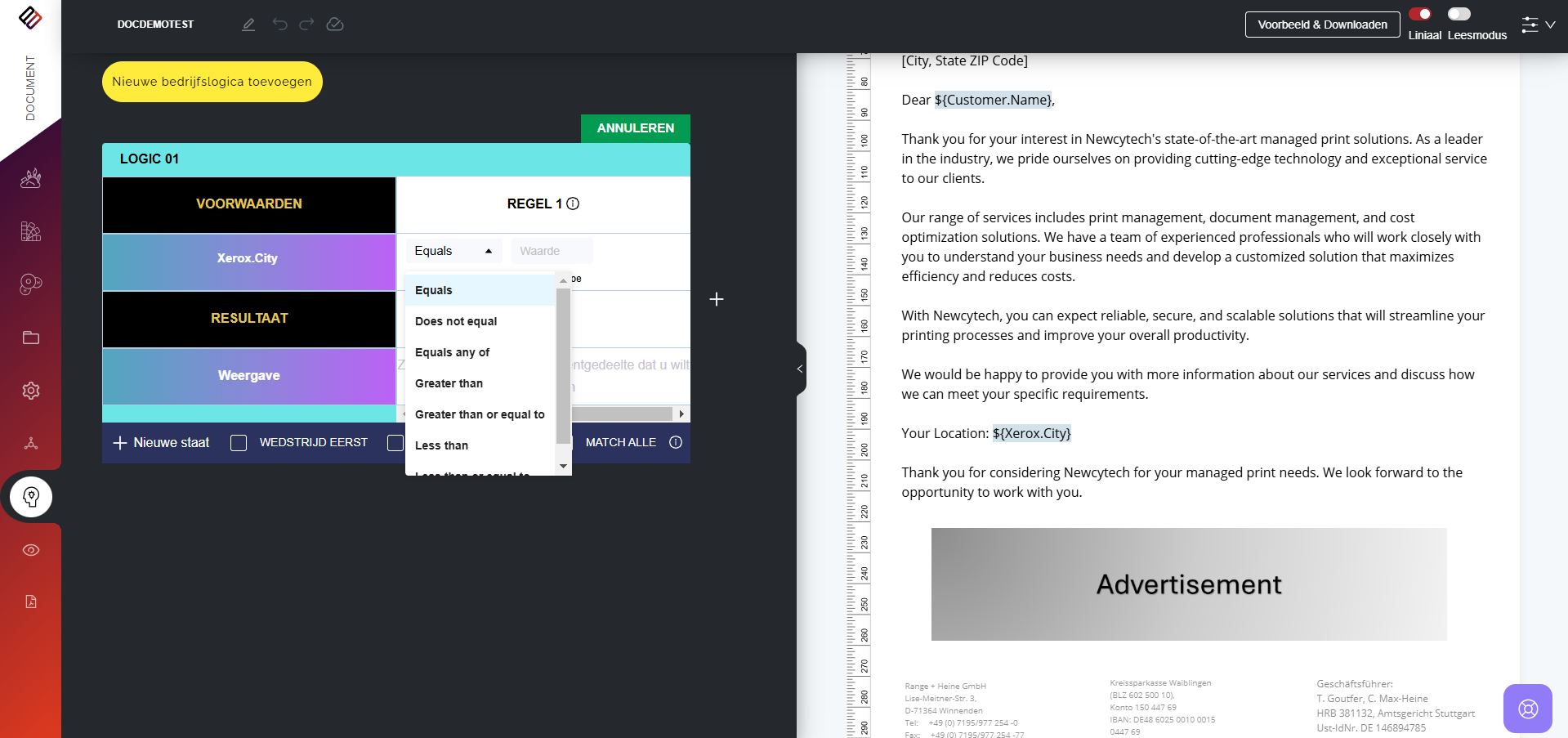 Bedrijfslogica verwijst naar de set regels en voorwaarden die bepalen hoe informatie binnen een document wordt weergegeven, gestructureerd of verwerkt. In plaats van statische, uniforme communicatie te genereren, zorgt bedrijfslogica ervoor dat documenten dynamisch kunnen worden aangepast op basis van klantgegevens, organisatiebeleid of specifieke workflows.