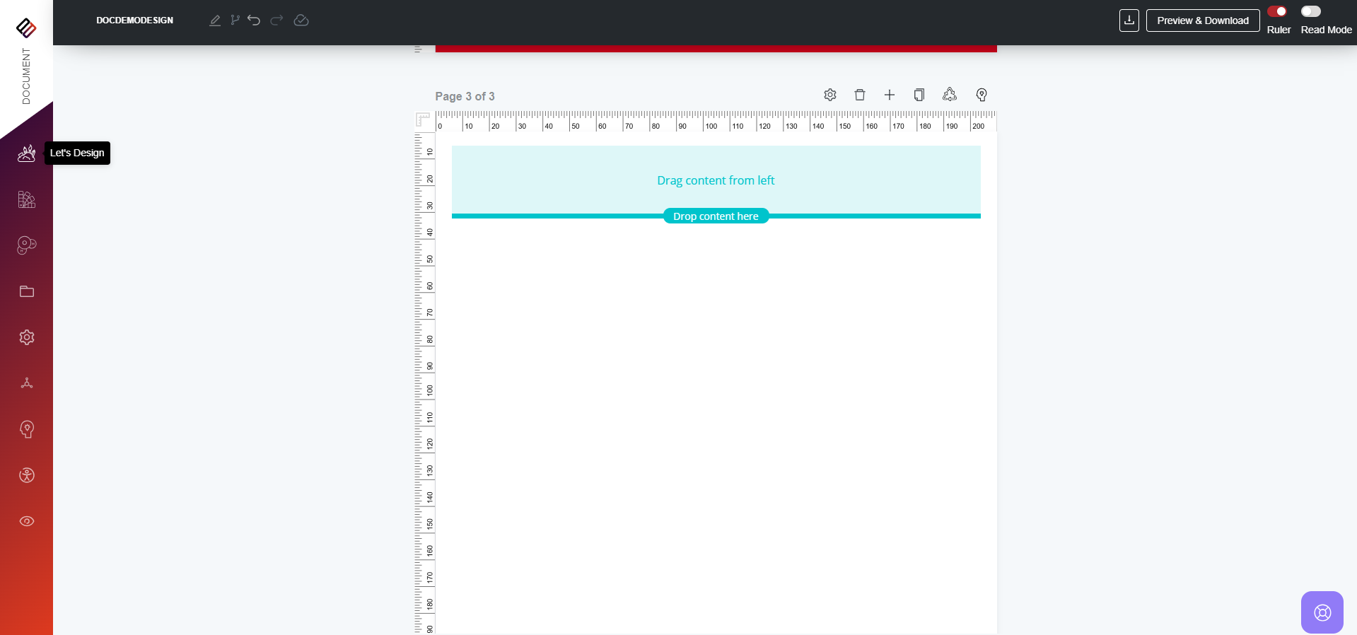 To insert or upload an image into your document's design, please follow the instructions below: 1. From the menu on the left, select the "Let’s Design" option. 2. Within this section, find and select the "Creative Block" feature, then drag it into ...