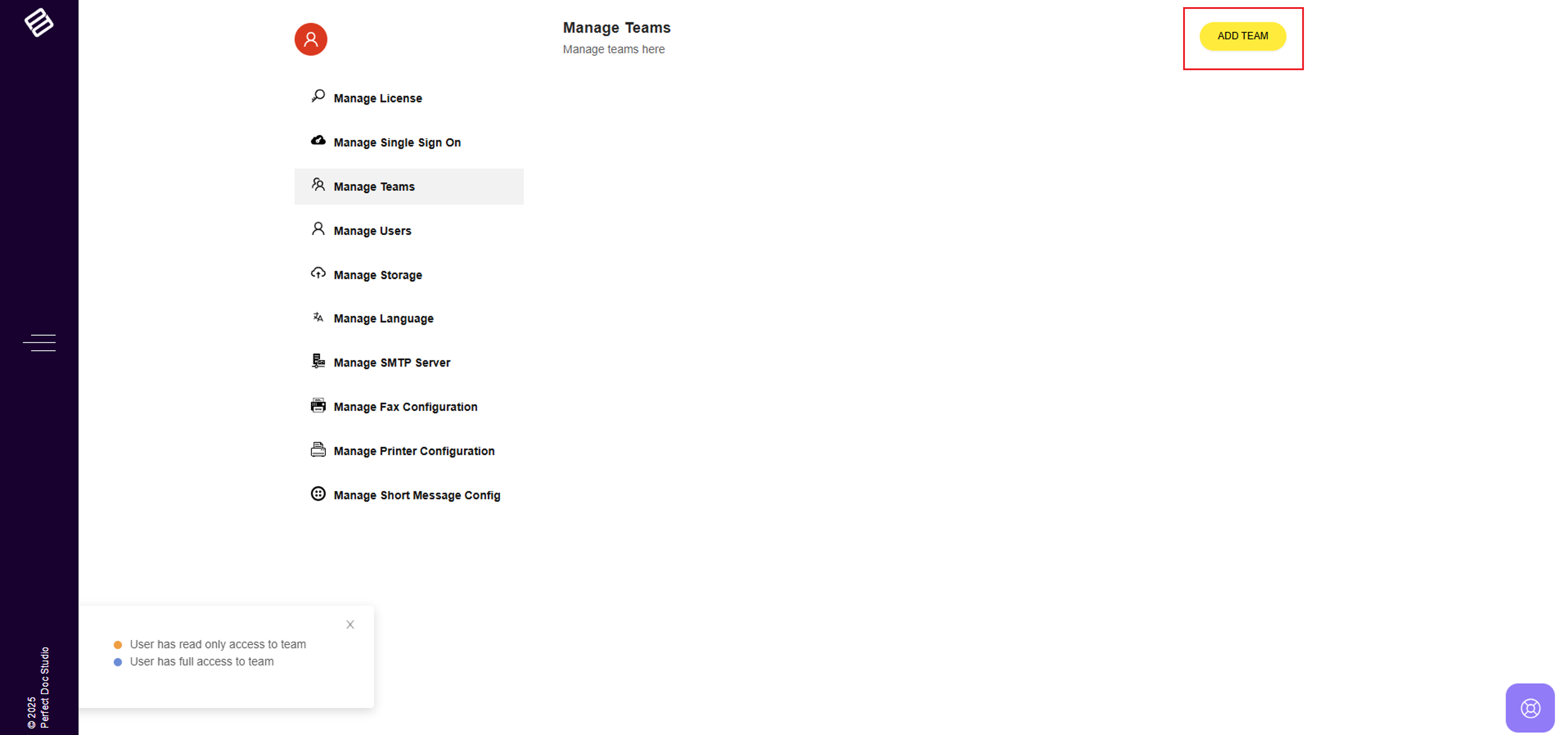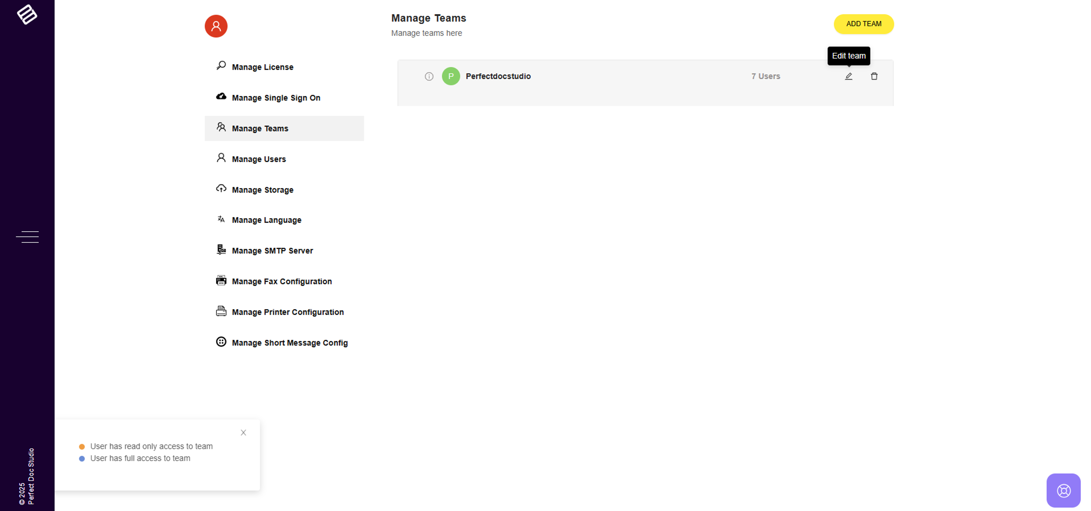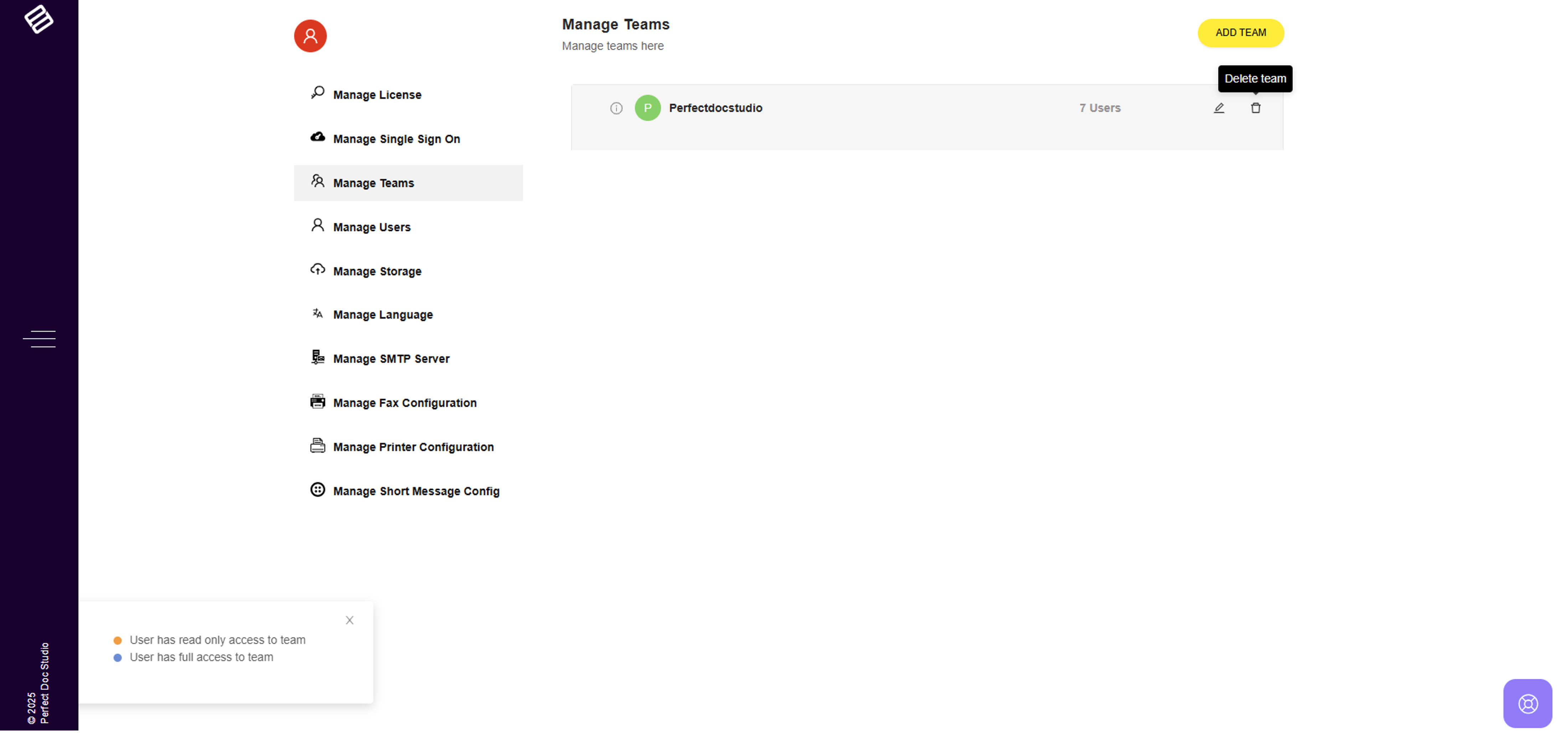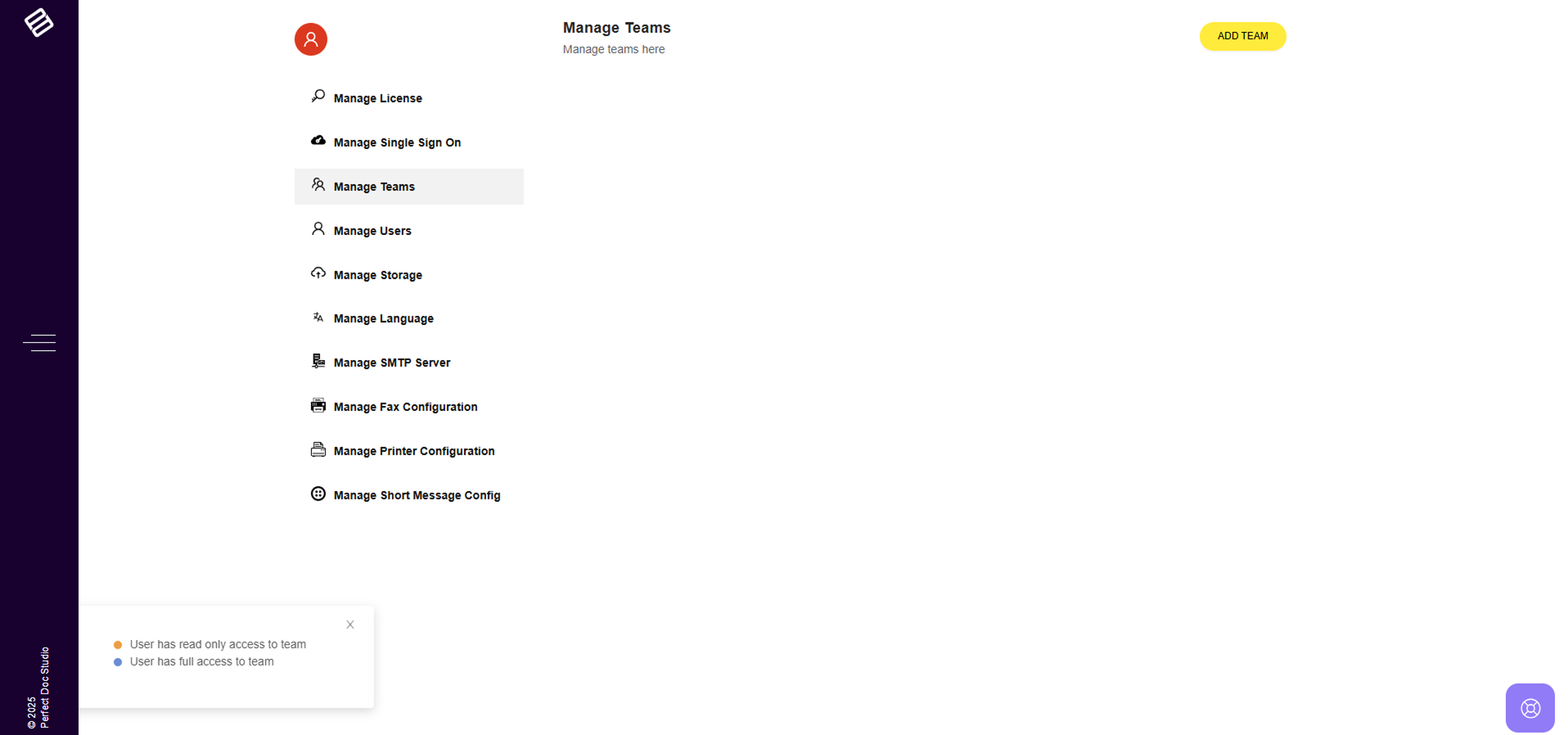 Team management in Perfect Doc Studio is simple and efficient. You can create multiple teams and assign users to them, allowing for precise access control.