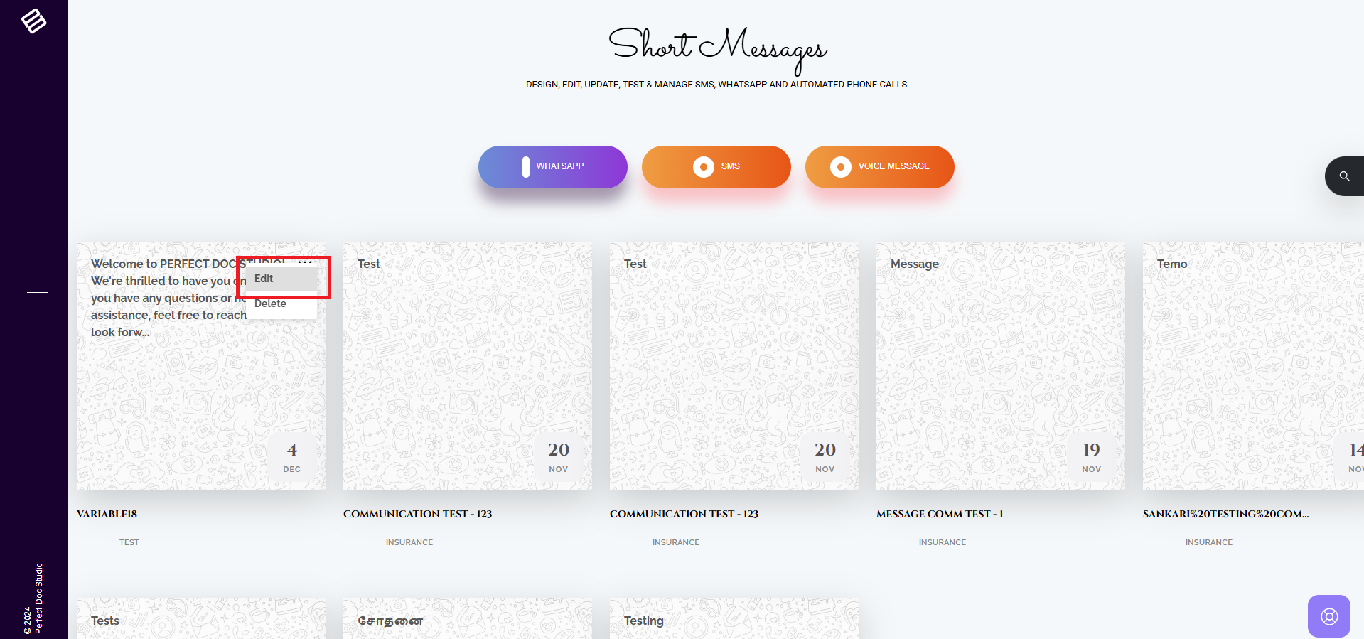 1. Navigate to the left-hand side menu and select Design System. 2. Under Design System, click on Short Messages. 3. You will see three options: SMS, WhatsApp, and Voice Message. Hover over any of these options until a plus symbol (+) appears, and ...