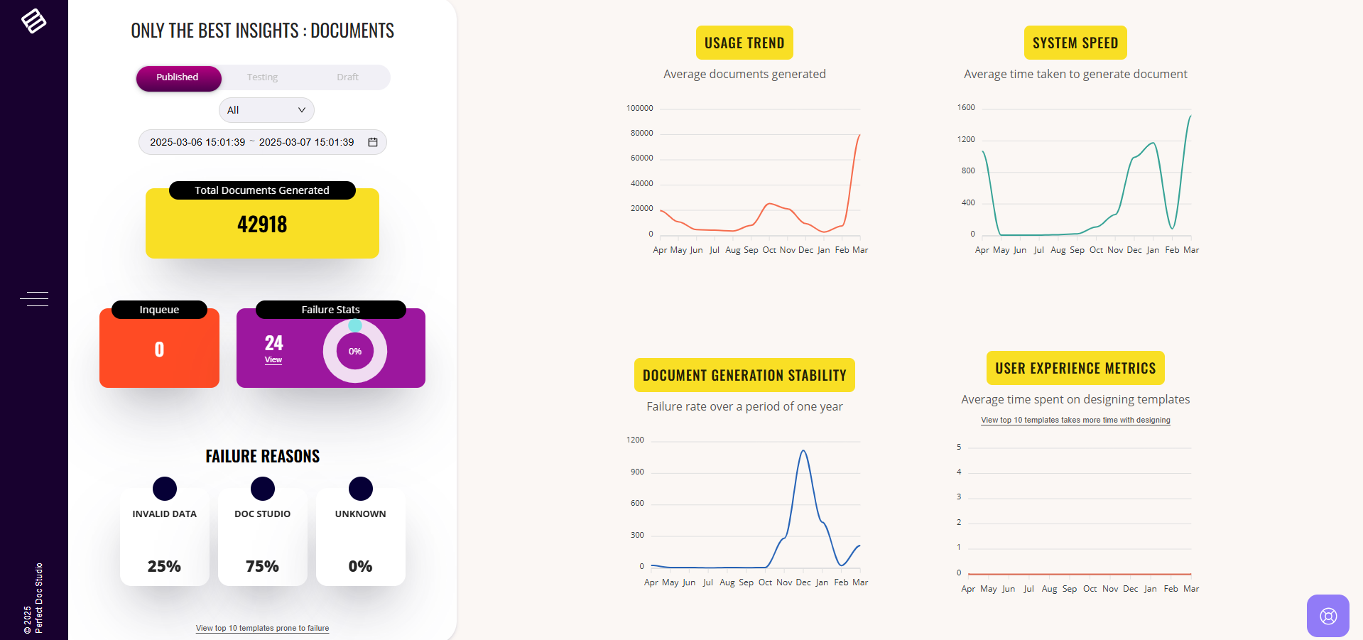 This section provides insights into the number of documents that failed to generate each month. By hovering over a specific month on the chart, you can access detailed data for that month, offering a clearer understanding of the stability in generating documents.