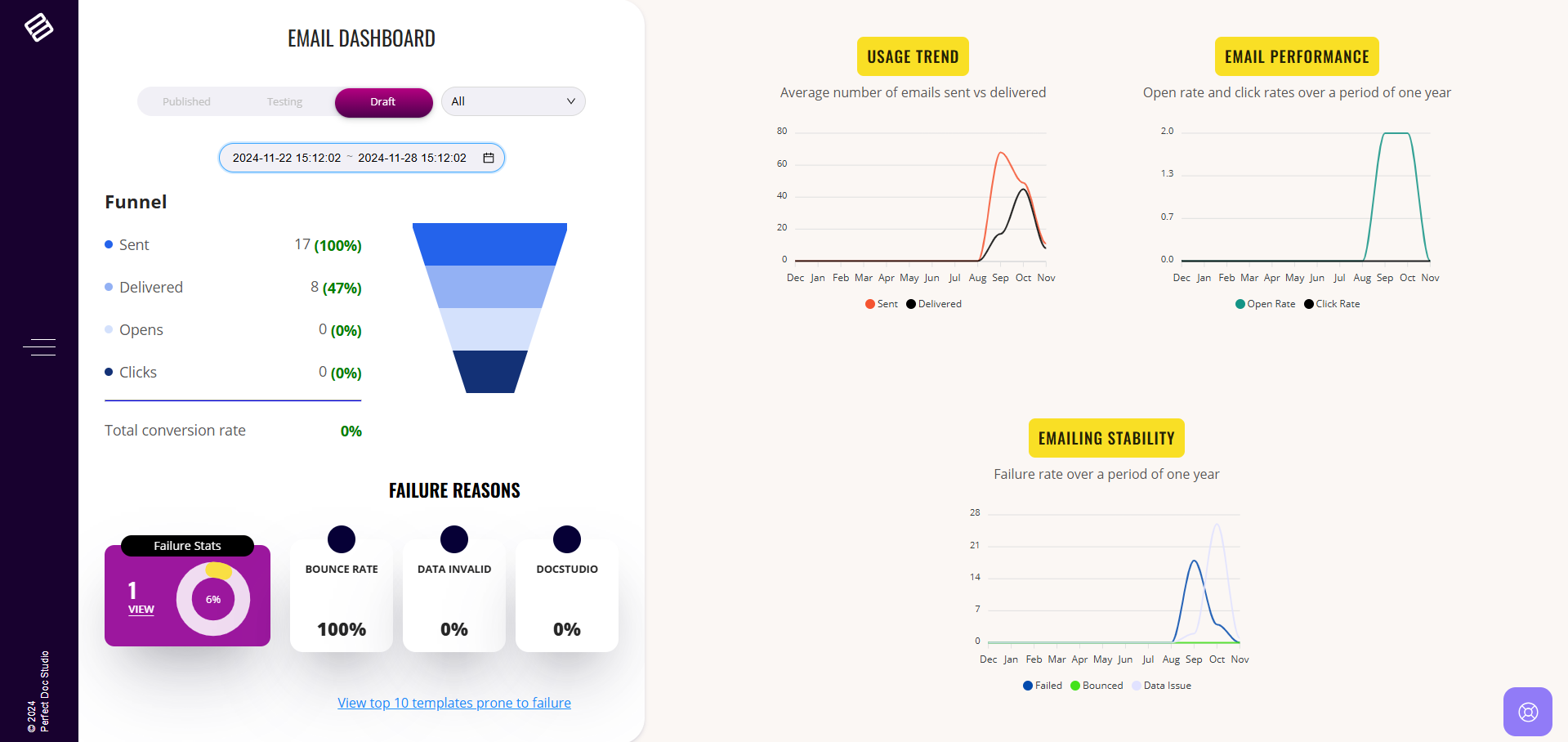 In this section, you can gain insights into the number of emails that failed to deliver. With a separate line graph for each failure reason, tracking and understanding the failure statistics for each reason in every month is made simple and clear.