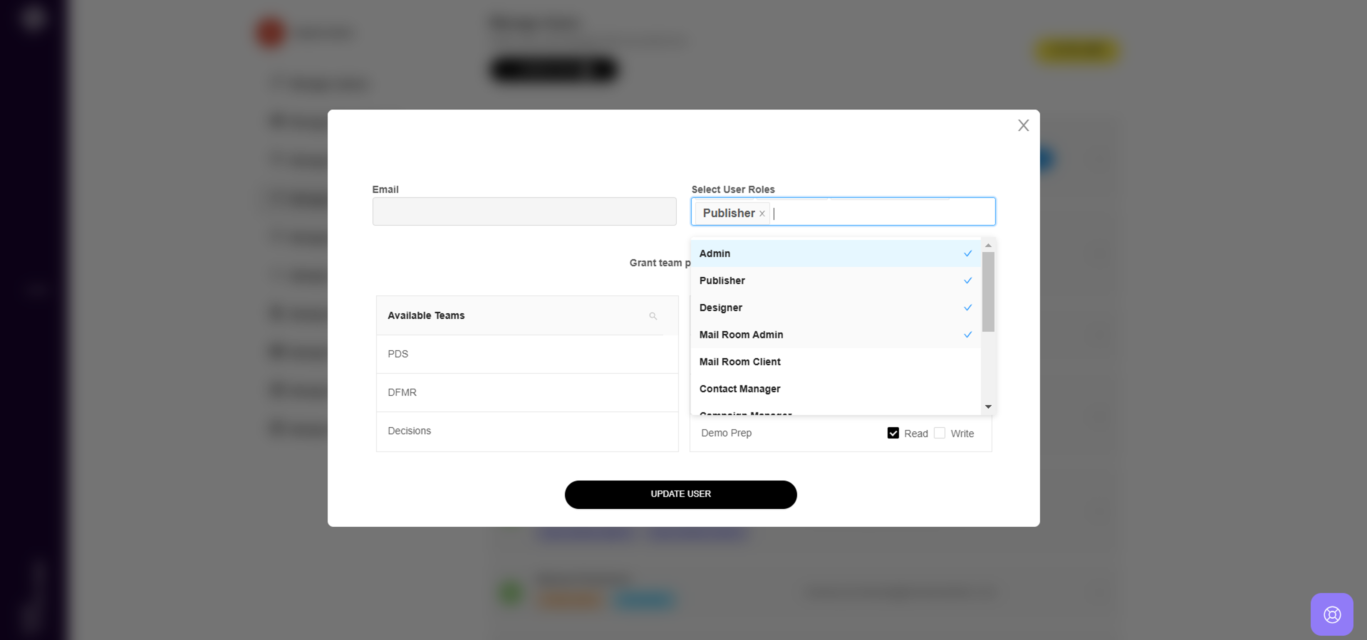 3. You can also modify the user's roles by using the "Select User Roles" option. To remove a role, click the "X" next to it; to add a role, choose one from the available roles in the drop-down list.