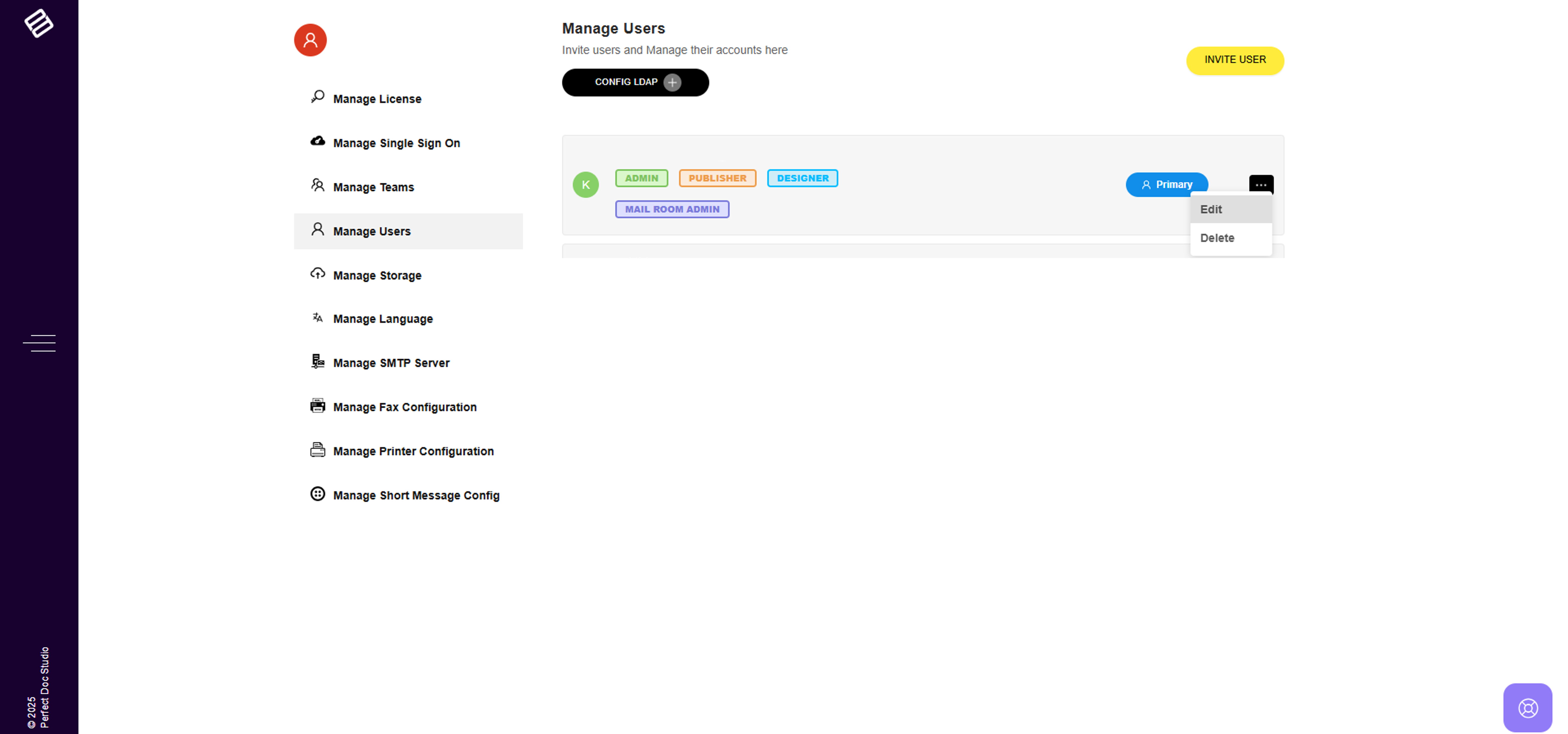In Perfect Doc Studio, a team can include as many users as necessary, each assigned specific roles and permissions based on their required access to the system. Follow these steps: 1. Click on the "Admin Configurations" option in the left-hand menu. ...