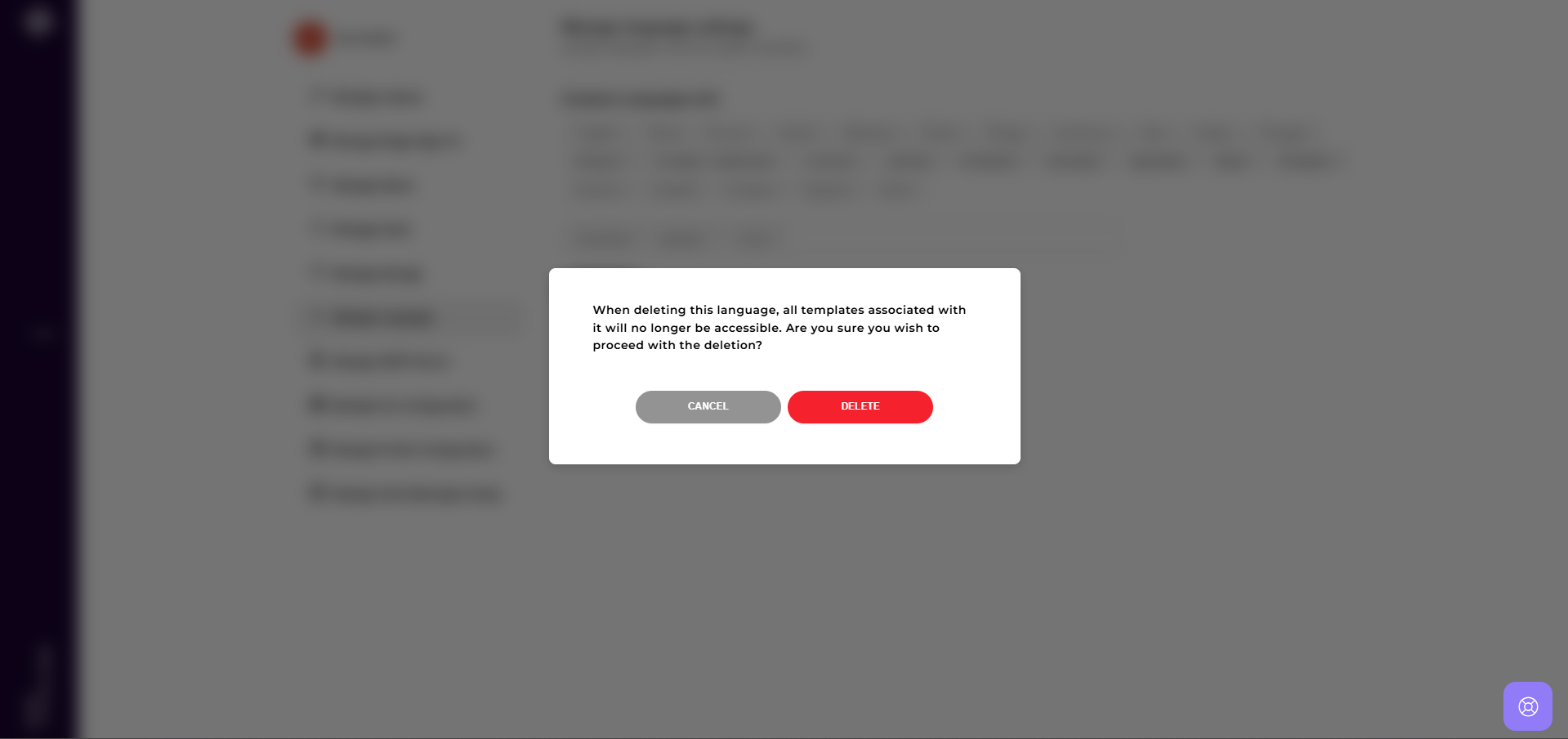 Warning: Removing a language from the system will permanently delete all templates created in that language, regardless of the team they belong to.