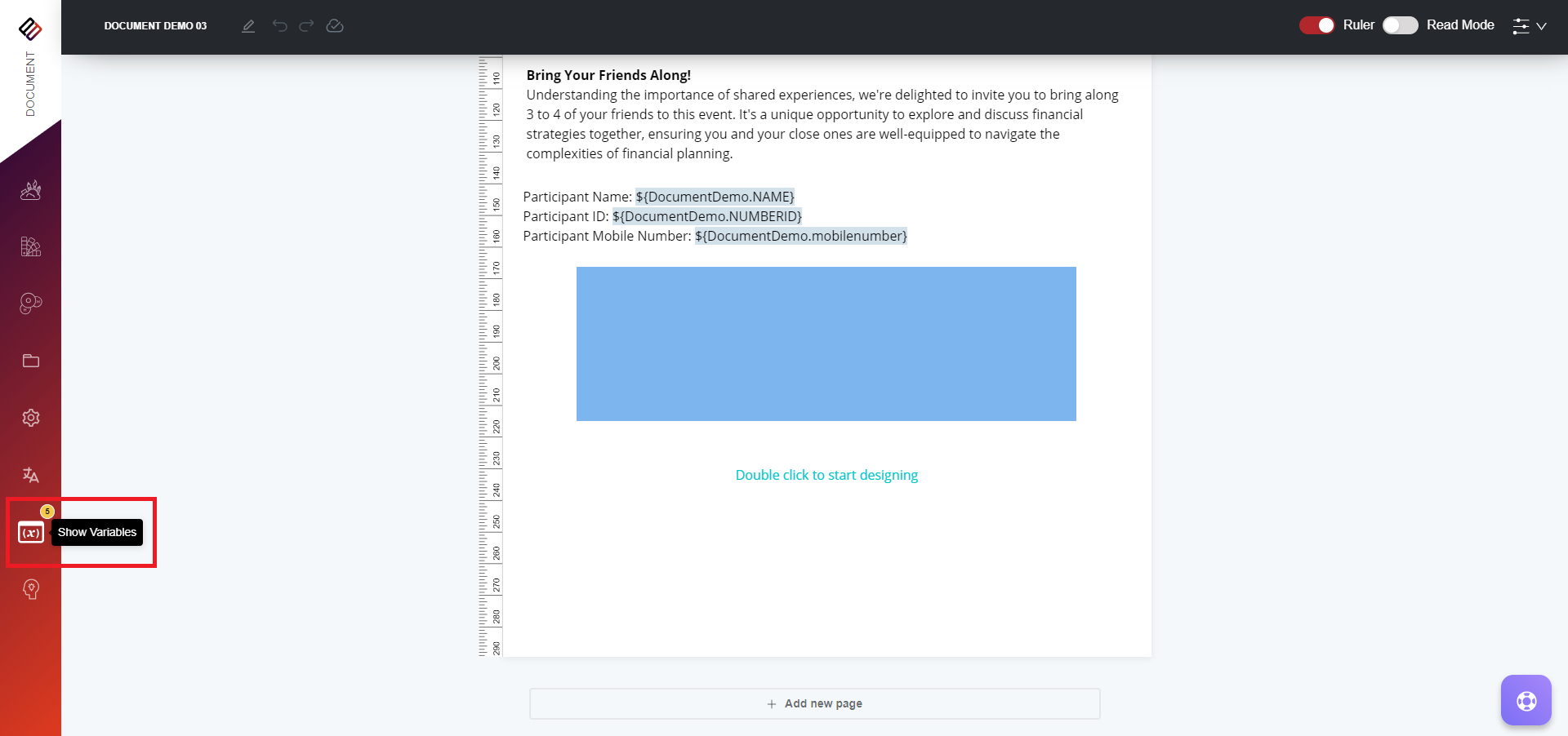 3. After completing the design process, whether it involves text with variables, dynamic images, or any design element, proceed to the "Show Variables" section.