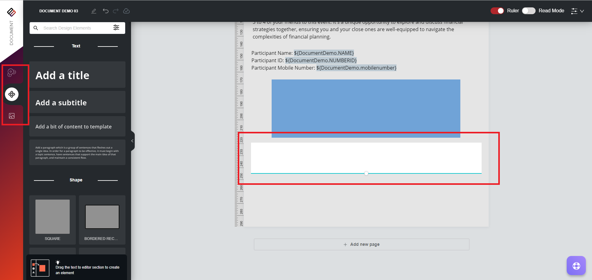 1. In the design area, drag and drop the Repeated Block element to the desired location where you want the sections to be repeated.