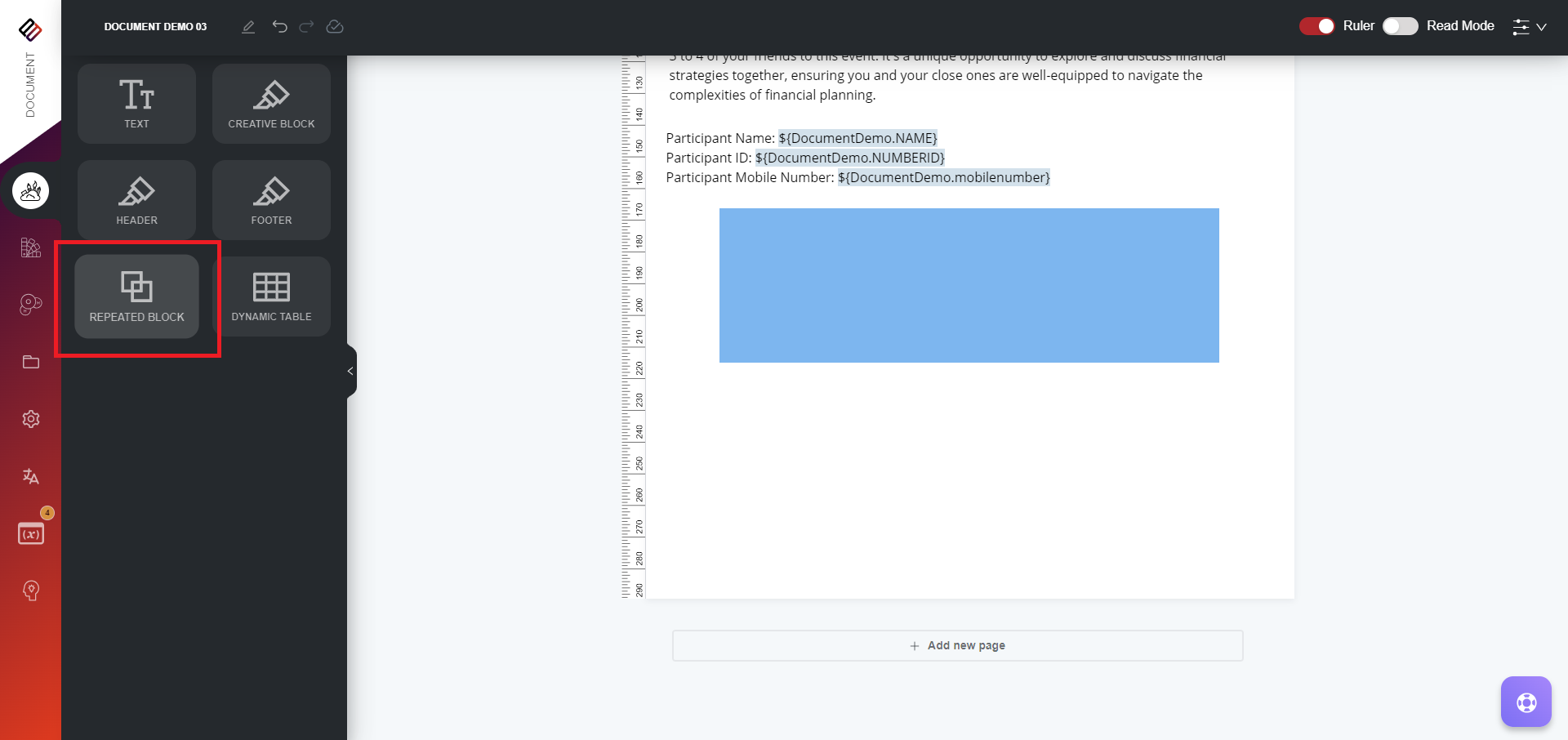 Here are the steps to add a Repeated Block to your document: