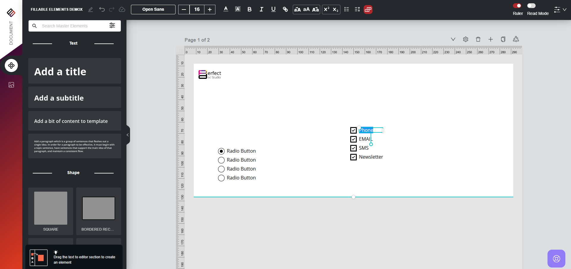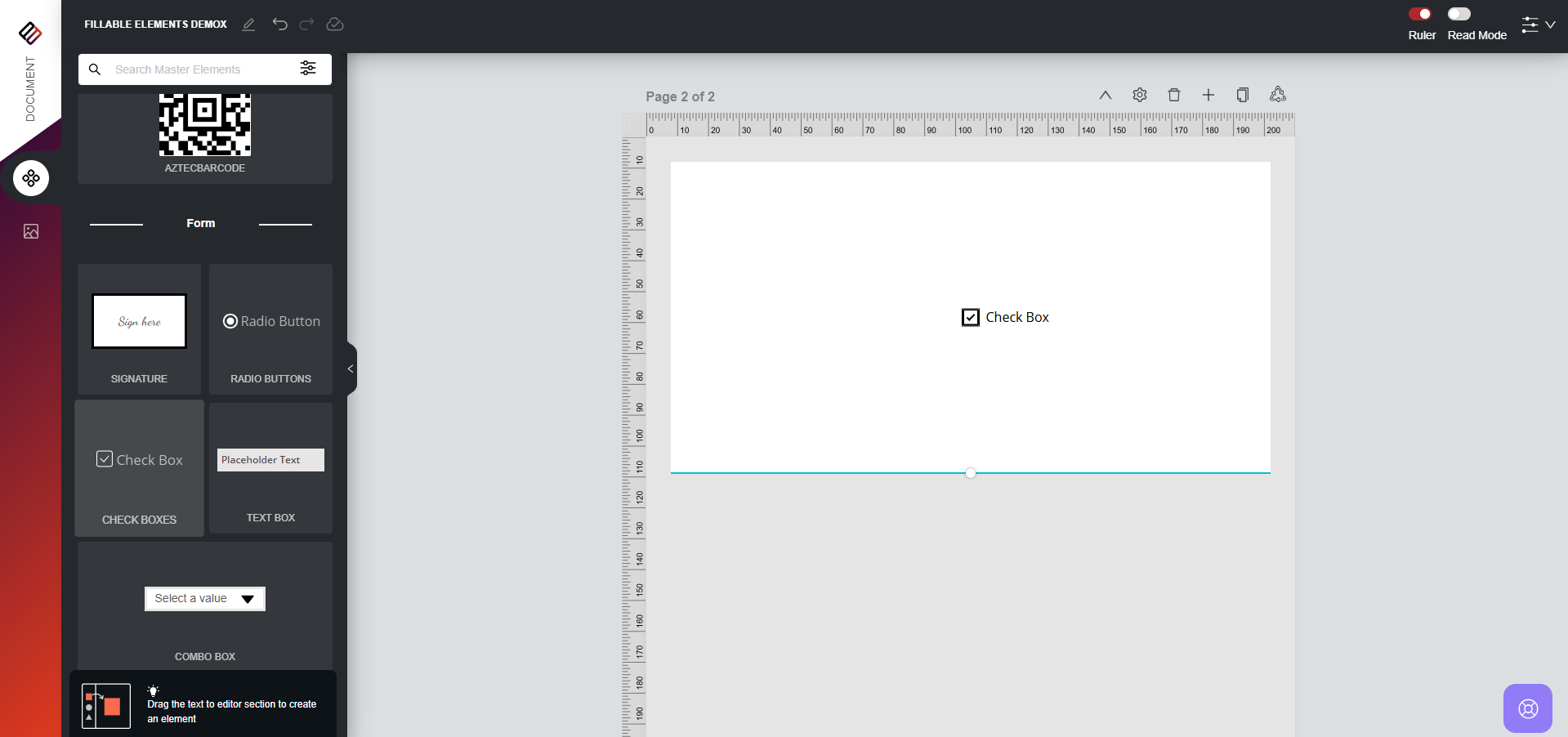 To insert a radio button, click the Check Box option from the Master Elements section in the side menu.