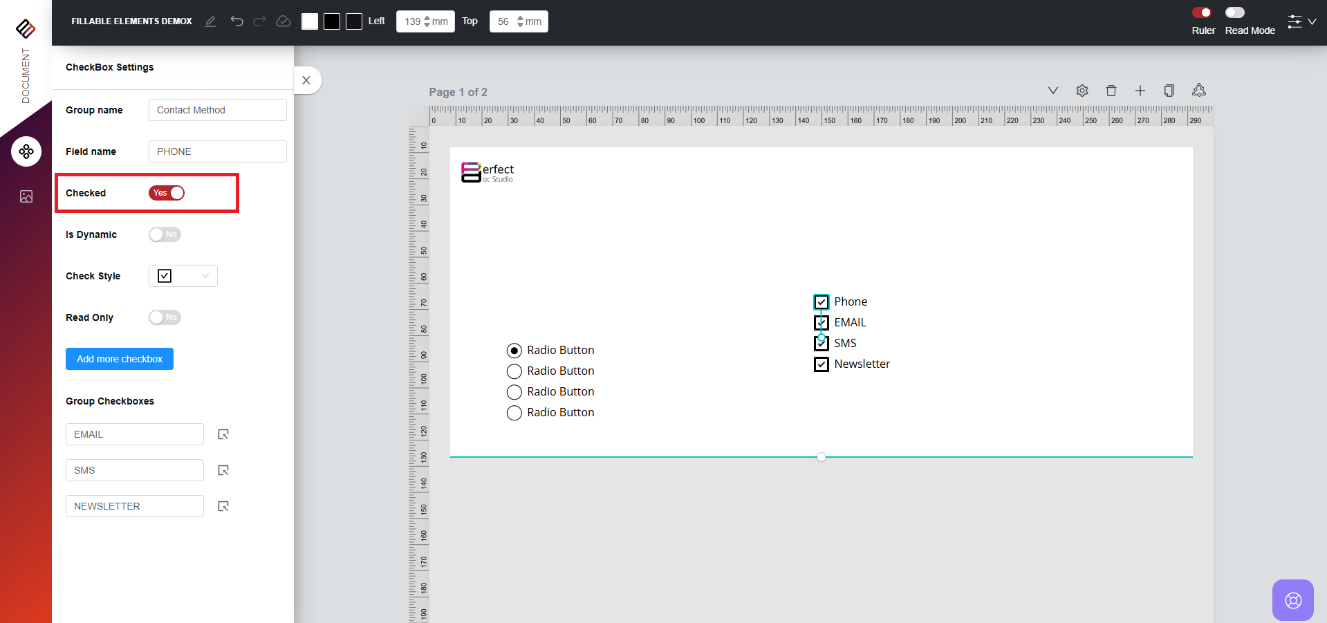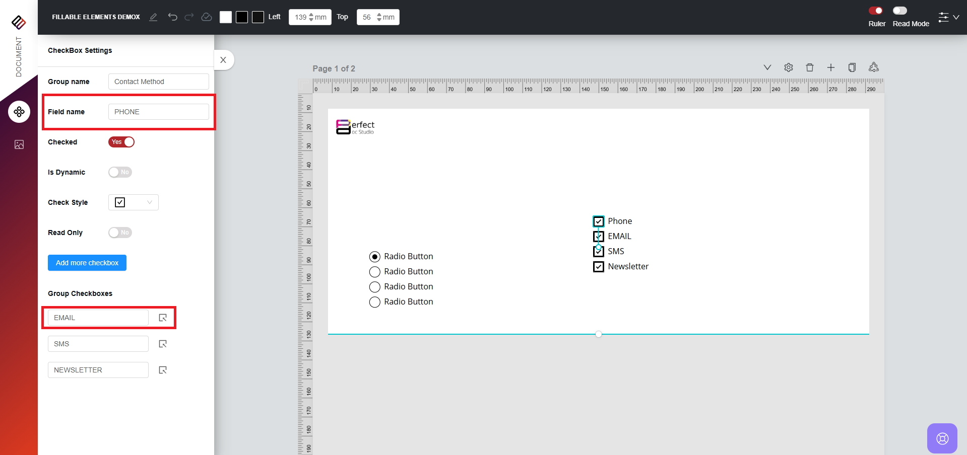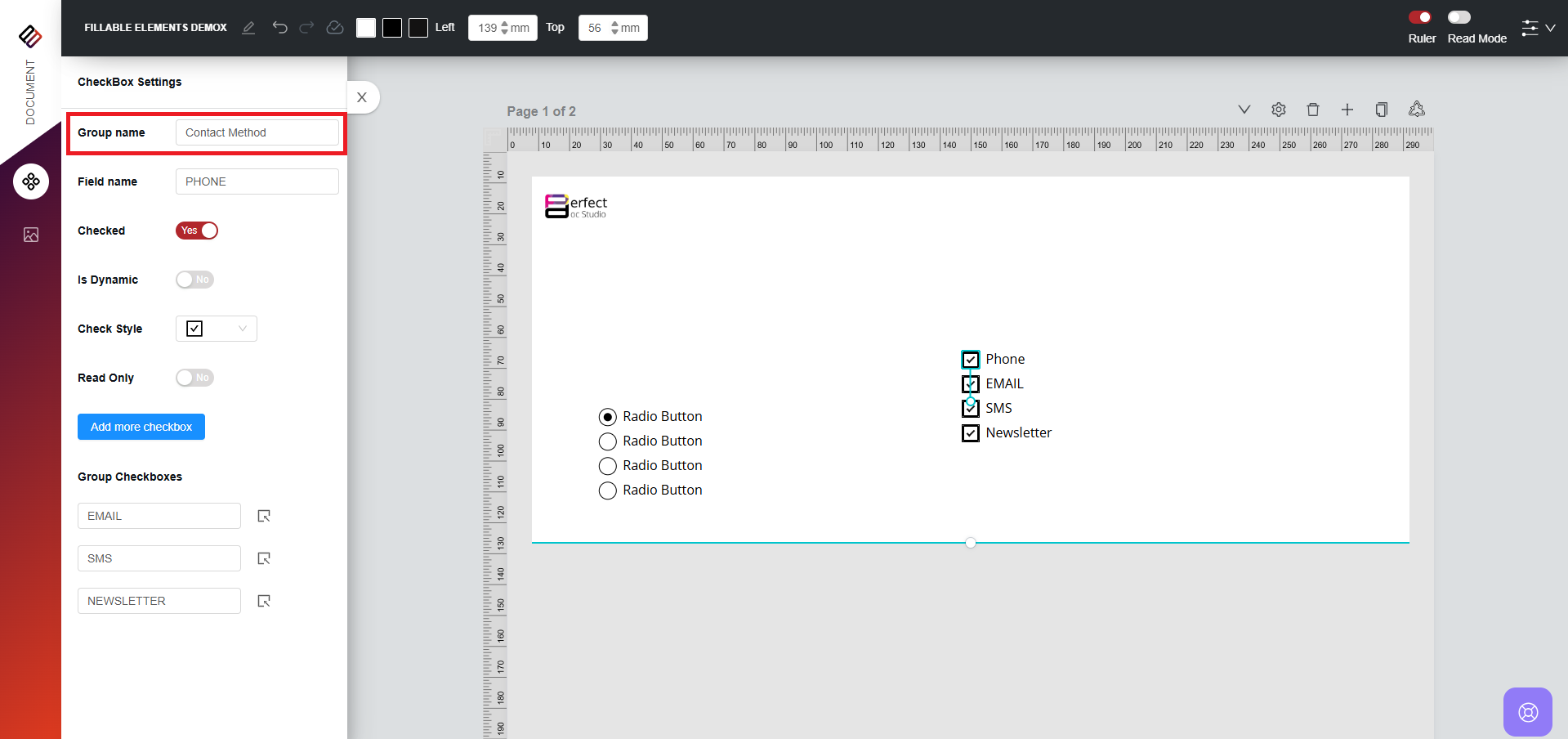 Field Name: This is the identifier for each individual checkbox. The field name can be customized but will not appear in the design preview. This field name will be under the group name and will serve as the identifier for a specific checkbox within that group. From the set of inserted checkboxes, we can set the primary checkbox to appear under the group name by clicking on the option next to it. Every newly added checkbox in the document will automatically be visible under the group name.