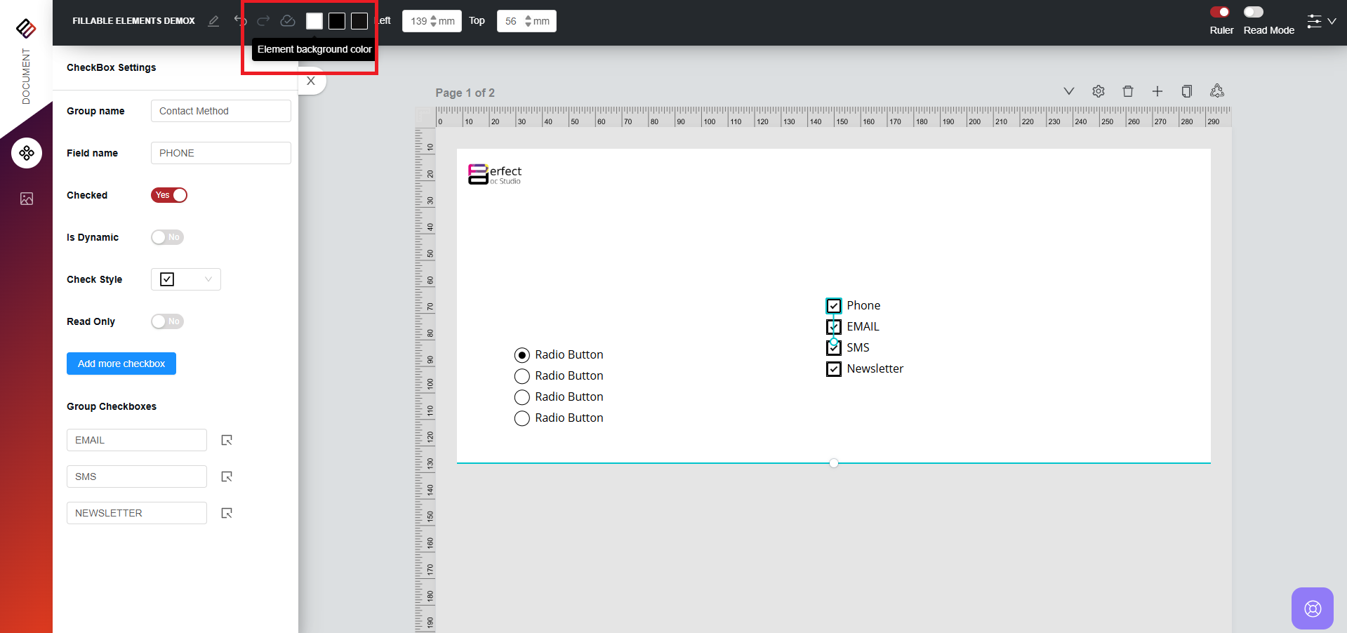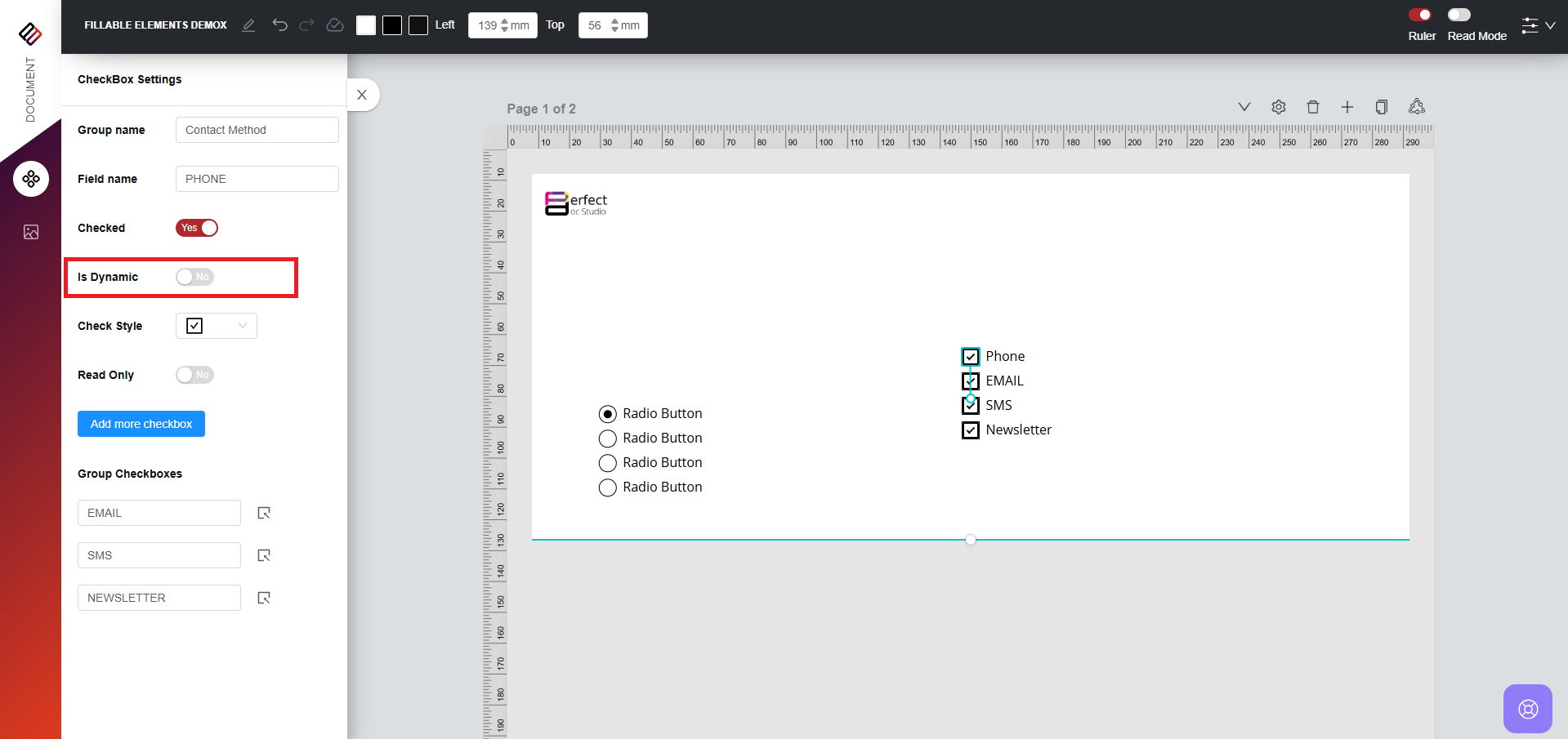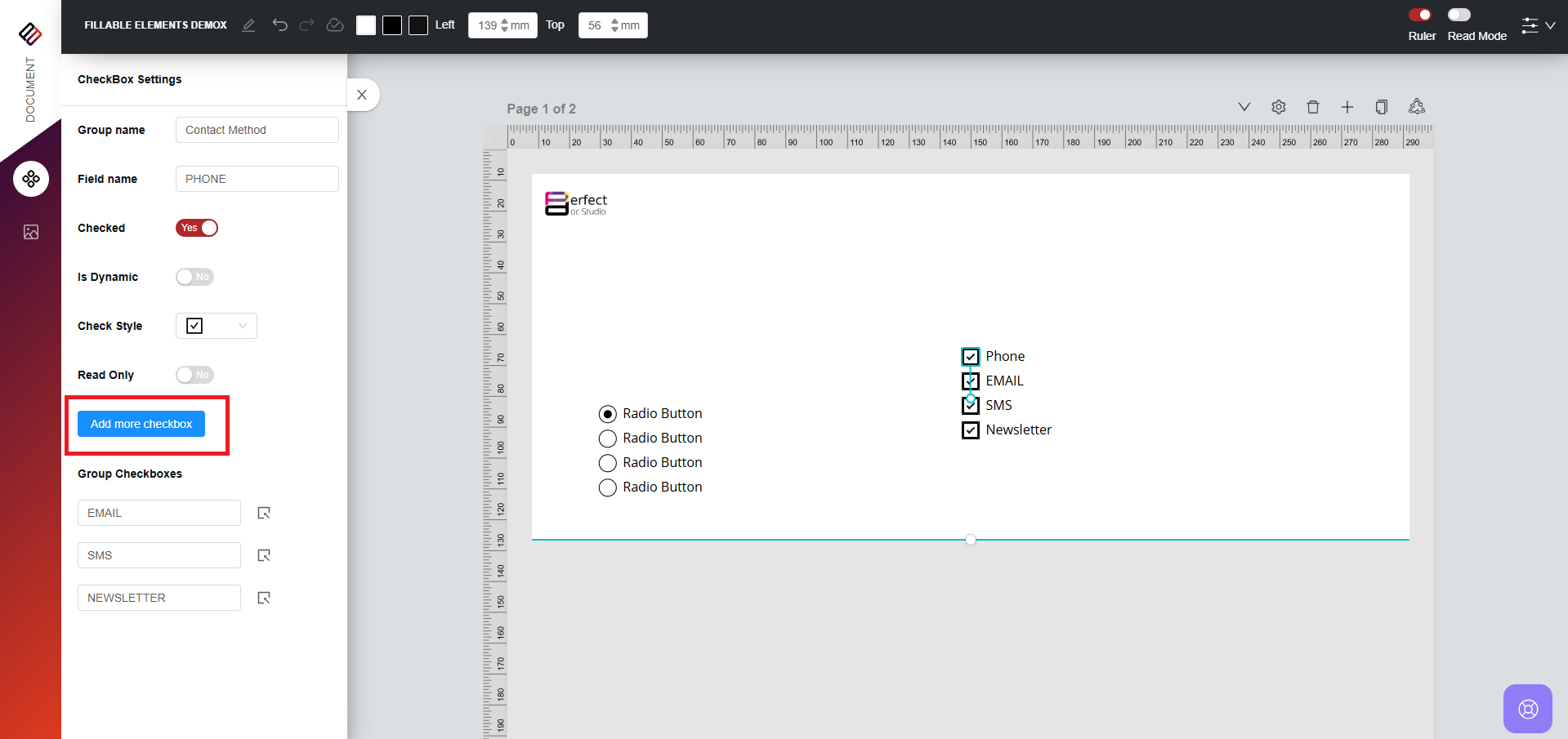 Field Name: This is the identifier for each individual checkbox. The field name can be customized but will not appear in the design preview. This field name will be under the group name and will serve as the identifier for a specific checkbox within that group. From the set of inserted checkboxes, we can set the primary checkbox to appear under the group name by clicking on the option next to it. Every newly added checkbox in the document will automatically be visible under the group name.