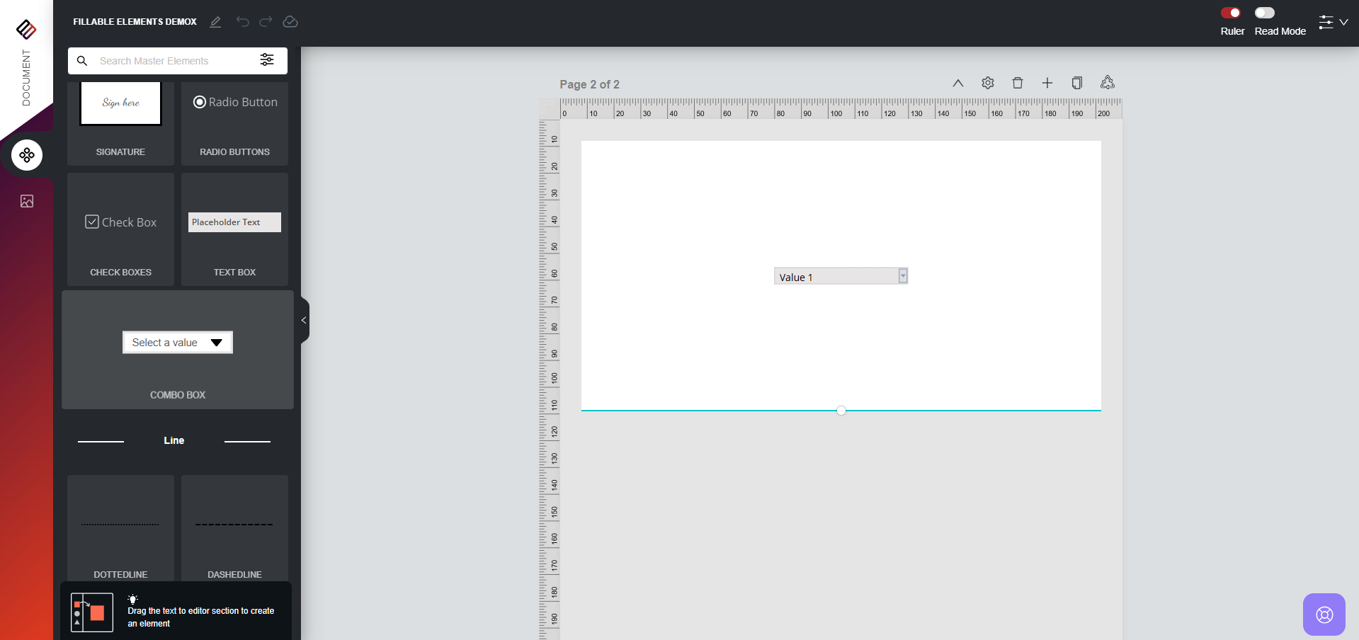 To insert a combo box, click the Combo box option from the Master Elements section in the side menu.