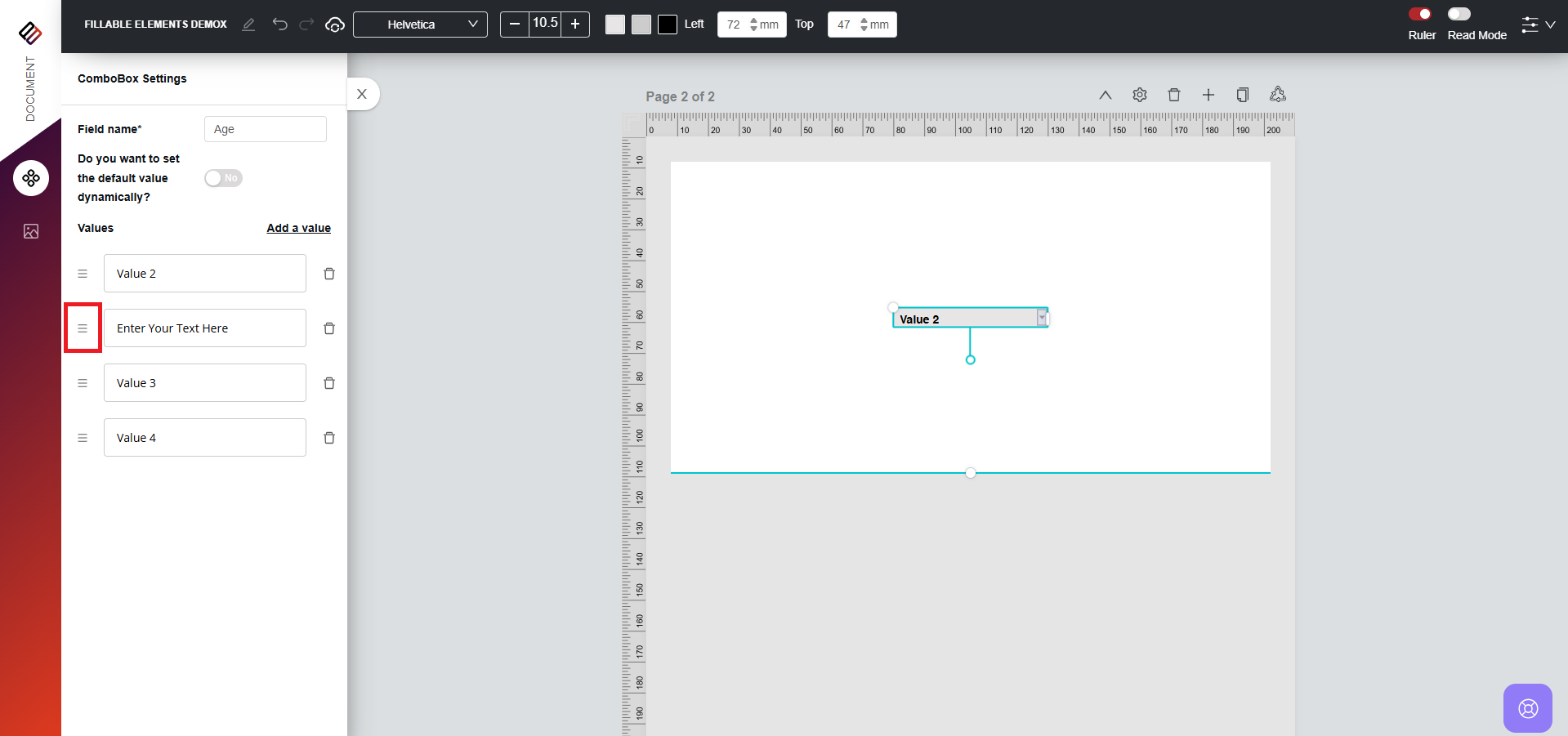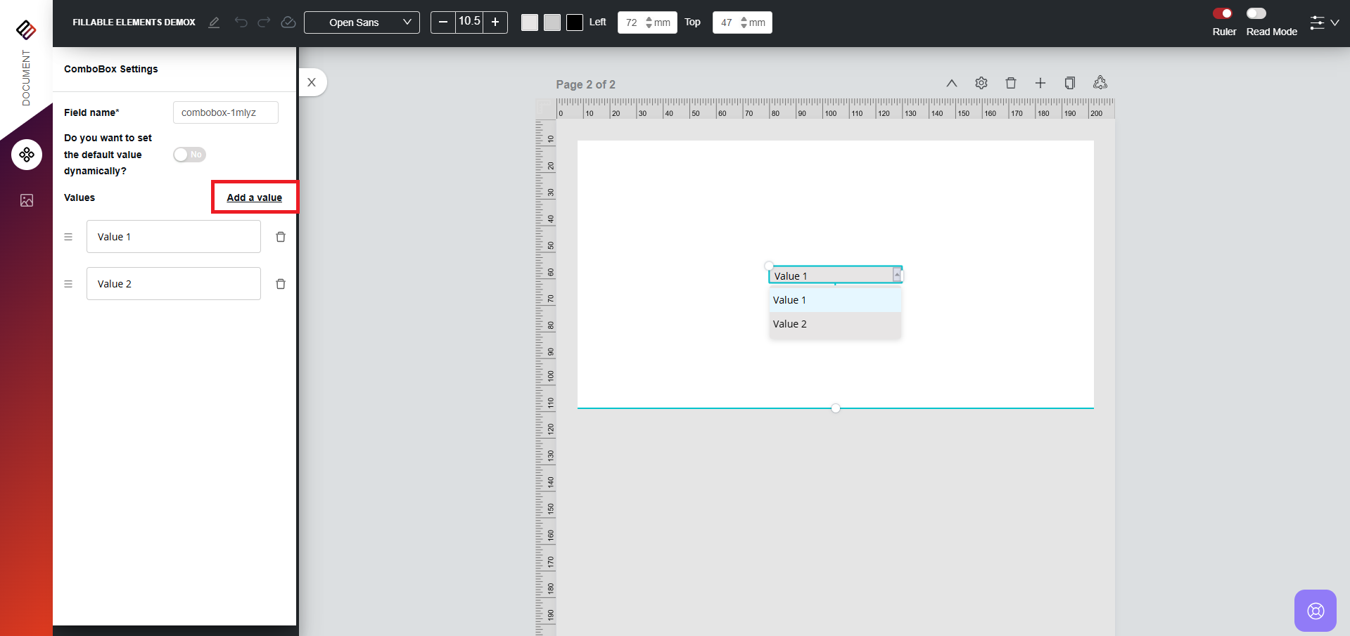 Adding Values: In the settings menu, click "ADD A VALUE" to add entries to the combo box.