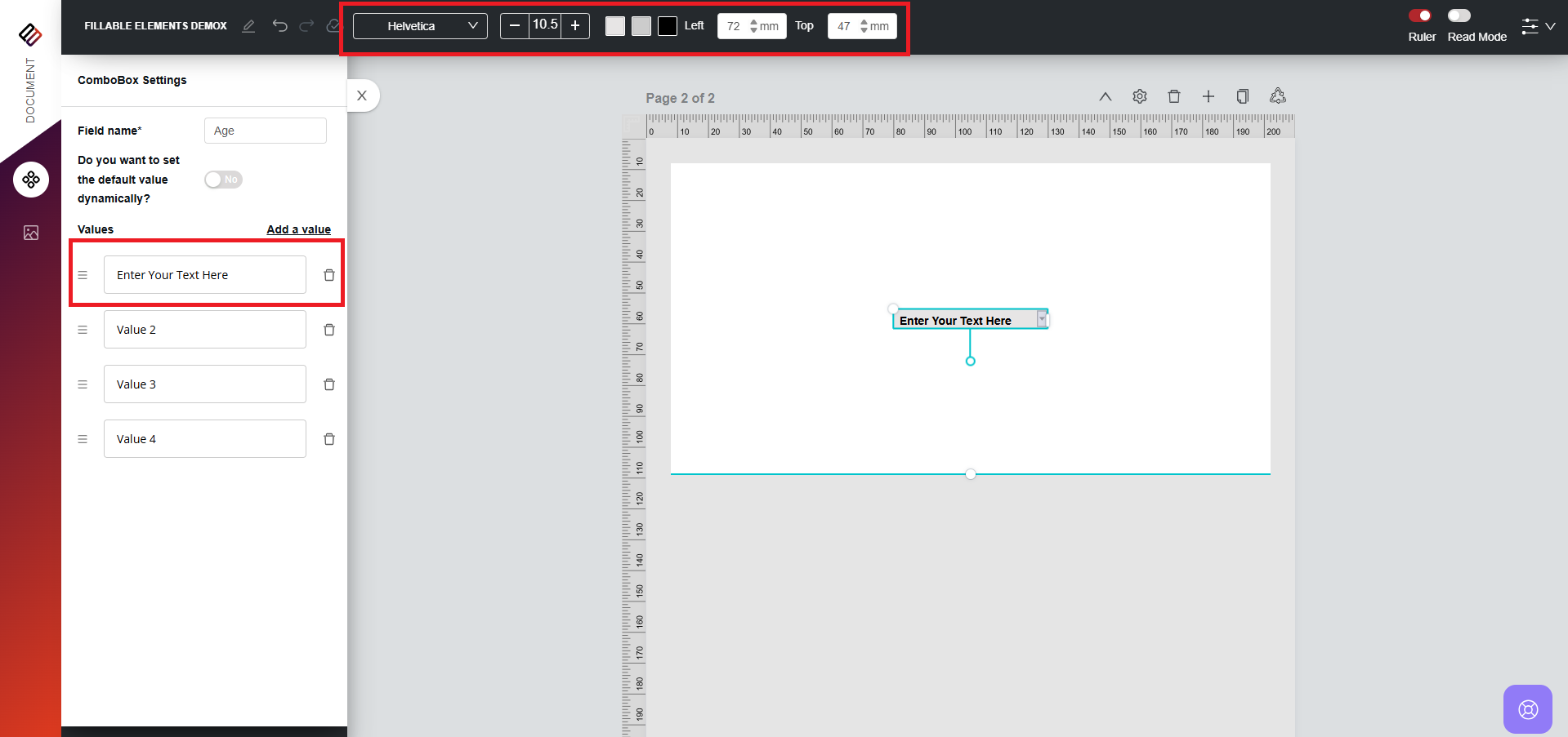 Click on the inserted combo box to access the combo box Settings, where you can manage the following options: