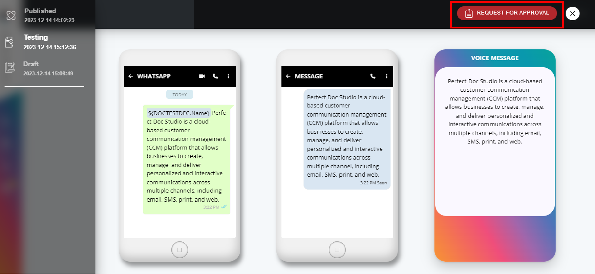 4. This will open up a model to choose between available channels like it did while sending the document for testing. Repeat the same here by selecting the SMS Channel and click the "Request for Approval" button.