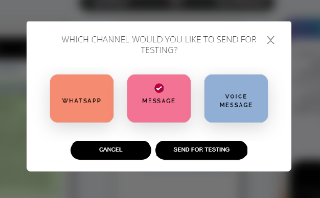 2. This will open up a model to choose between the available channel options. Choose SMS and click on the "Send for Testing" button.