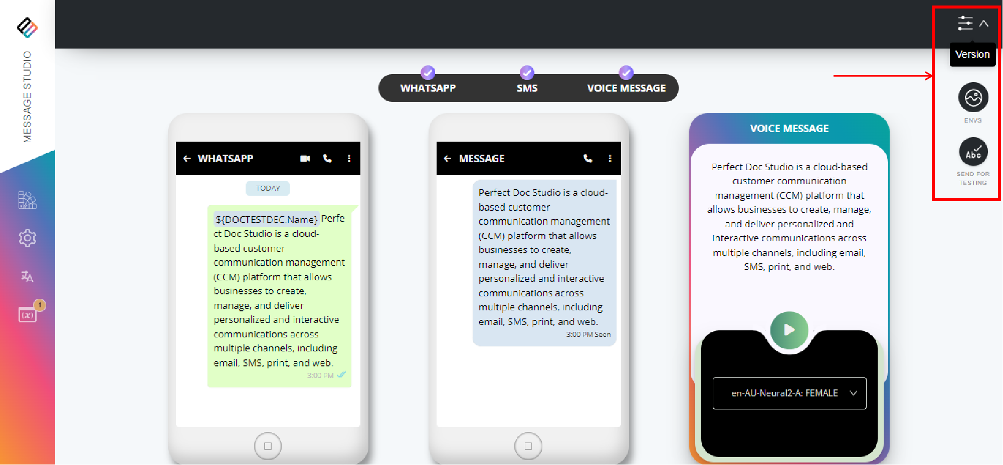 1. After completing designing the template, hover over to the top right corner of the page and click on the "Version" button. Select "Send for Testing" from the drop-down list.