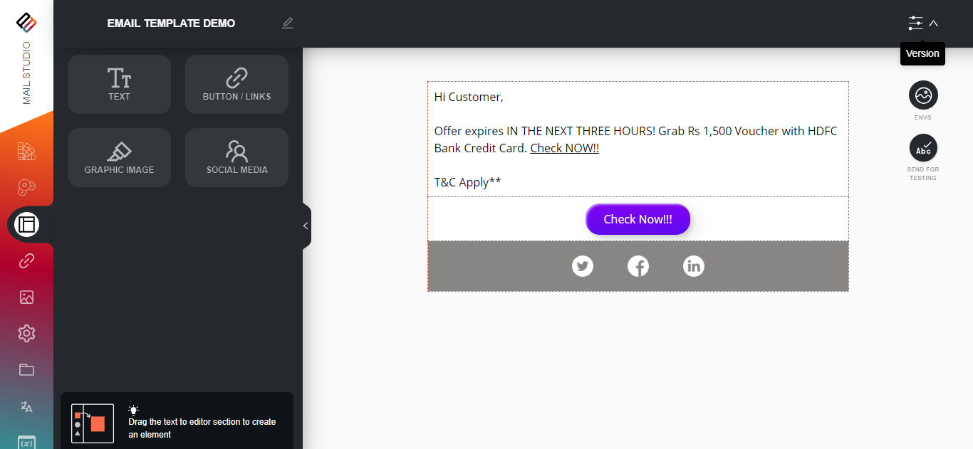 1. After finishing the template design, navigate to the top right corner of the page and click on the "Version" button. Choose "Send for Testing" from the dropdown menu.