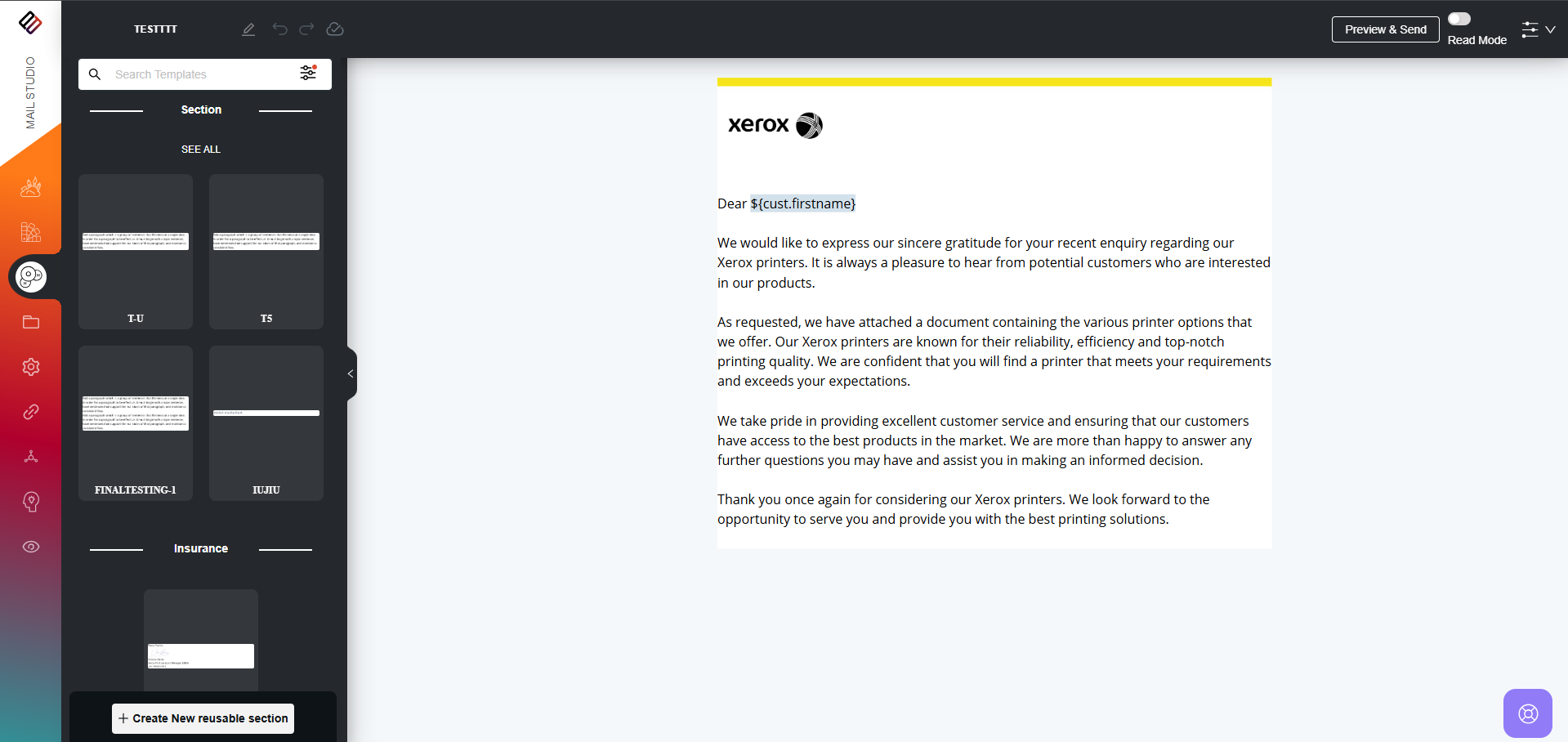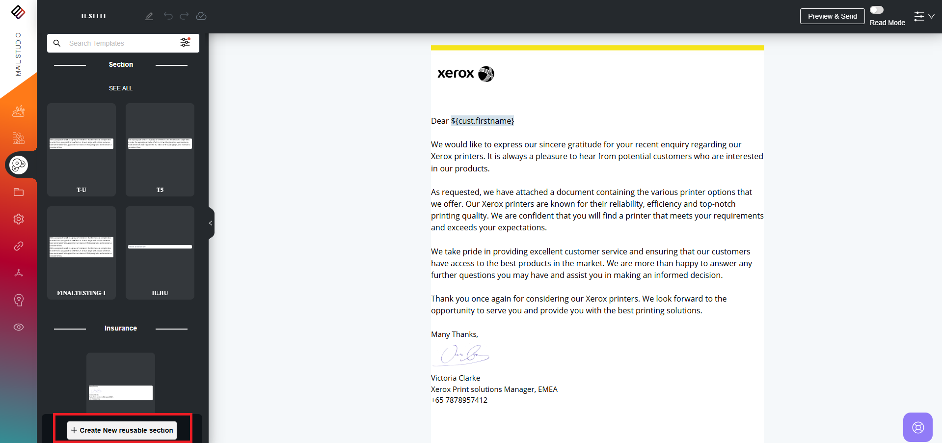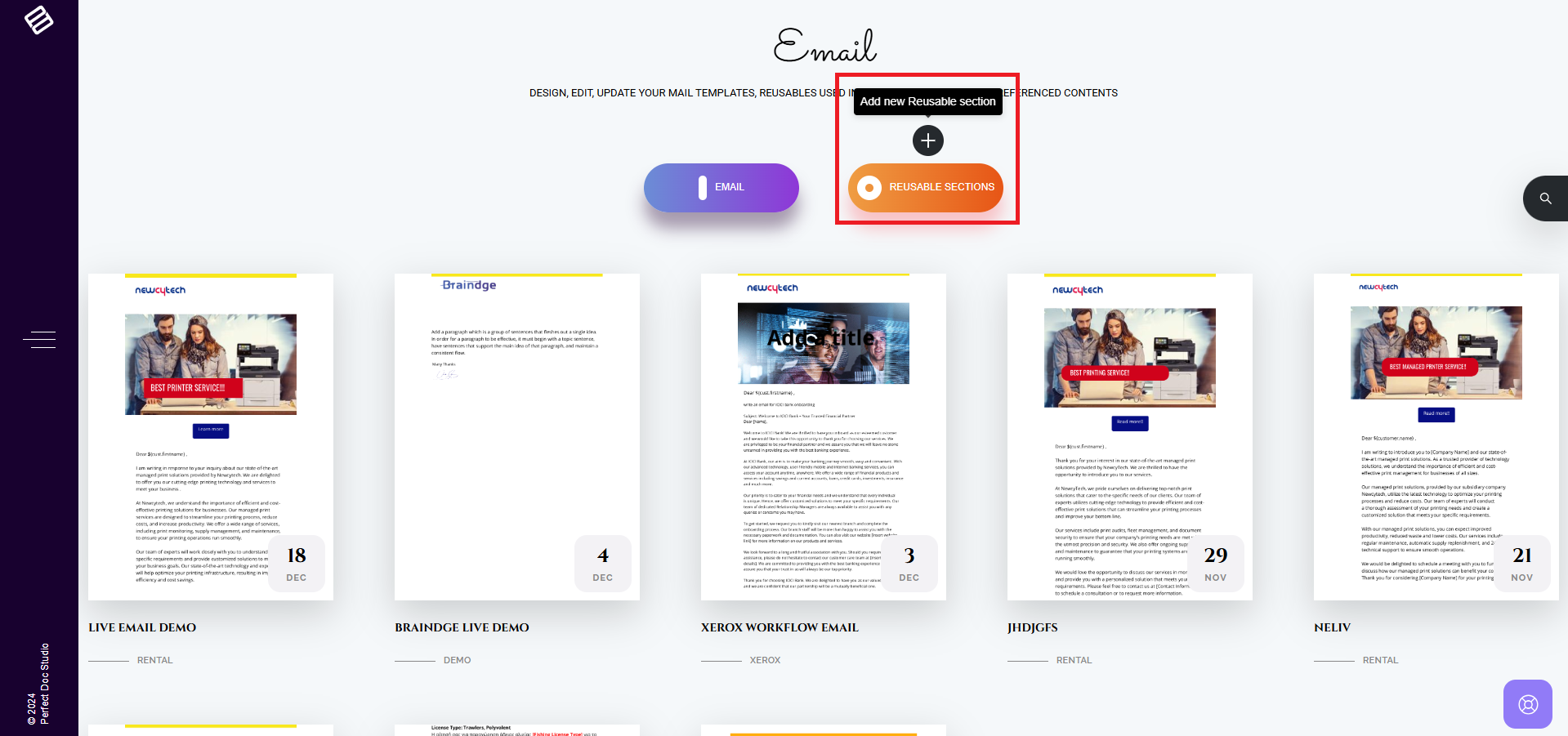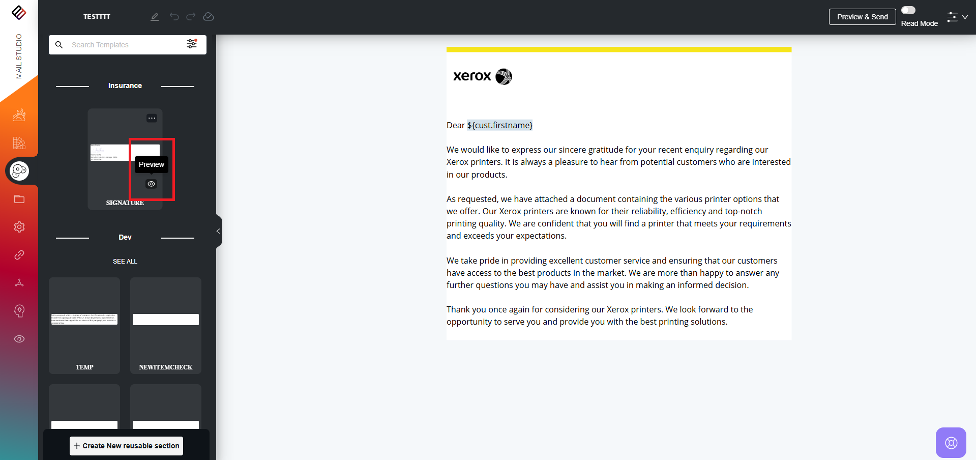 3. Users also have the option to preview a reusable section by clicking on the Eye icon located at the bottom corner of each section.