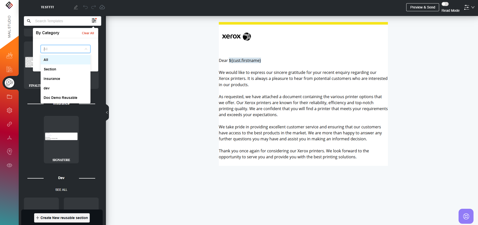 Users can also search for reusable sections by their names or any associated tags. Additionally, sections can be filtered based on categories, making it easier to locate and use the desired components.