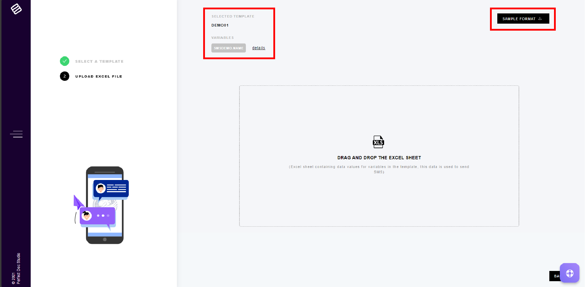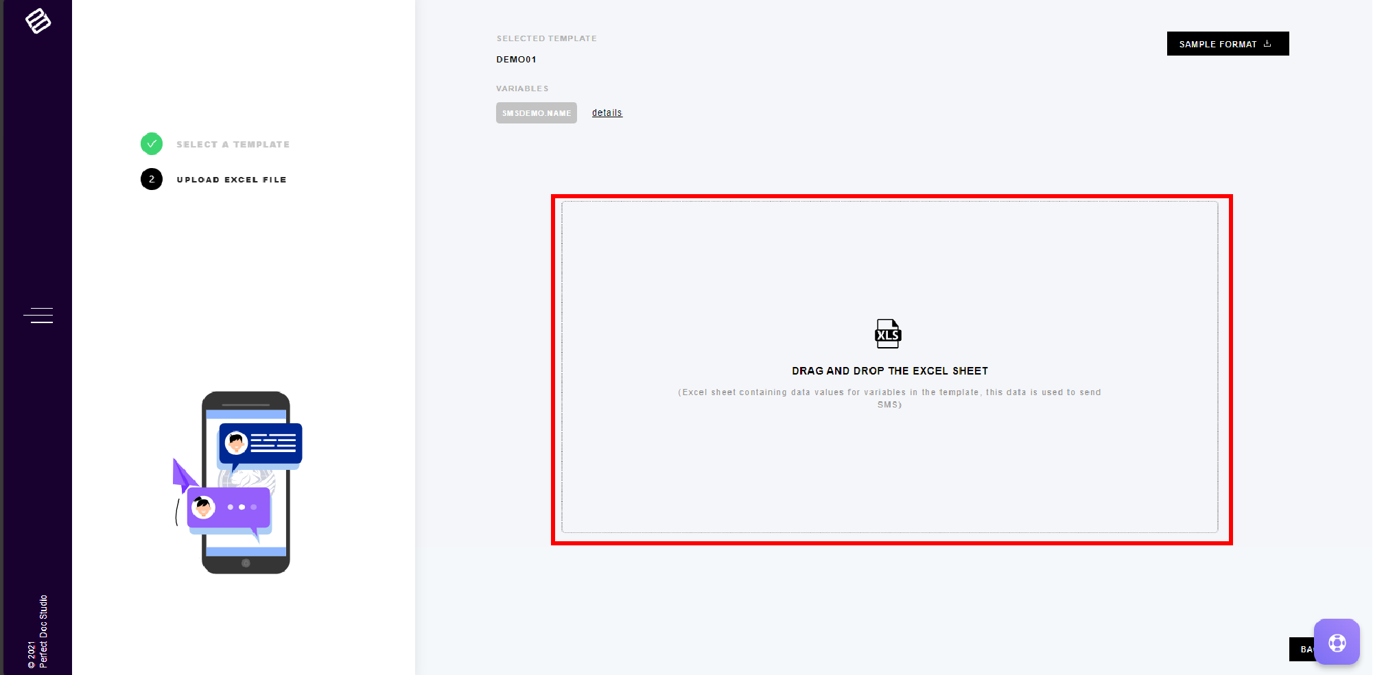 4. Upon selecting the template, a window will appear displaying the details of the selected template and the available variables within the chosen template. Navigate to the upper right corner of the page, and click on the "Sample Format" option to download the Excel sheet for entering data corresponding to the variables embedded in the template.