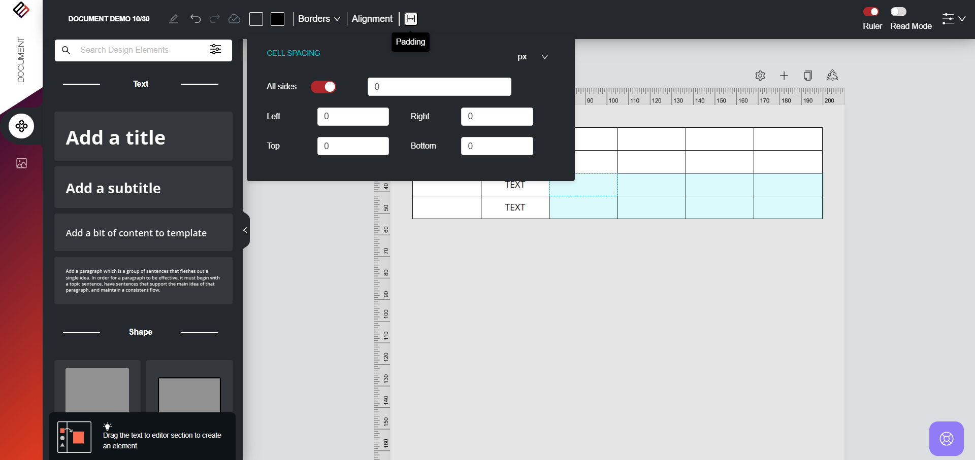 Adjust cell spacing using the Padding menu. You can either adjust padding for the entire cell or set individual spacing for each side of the cell.